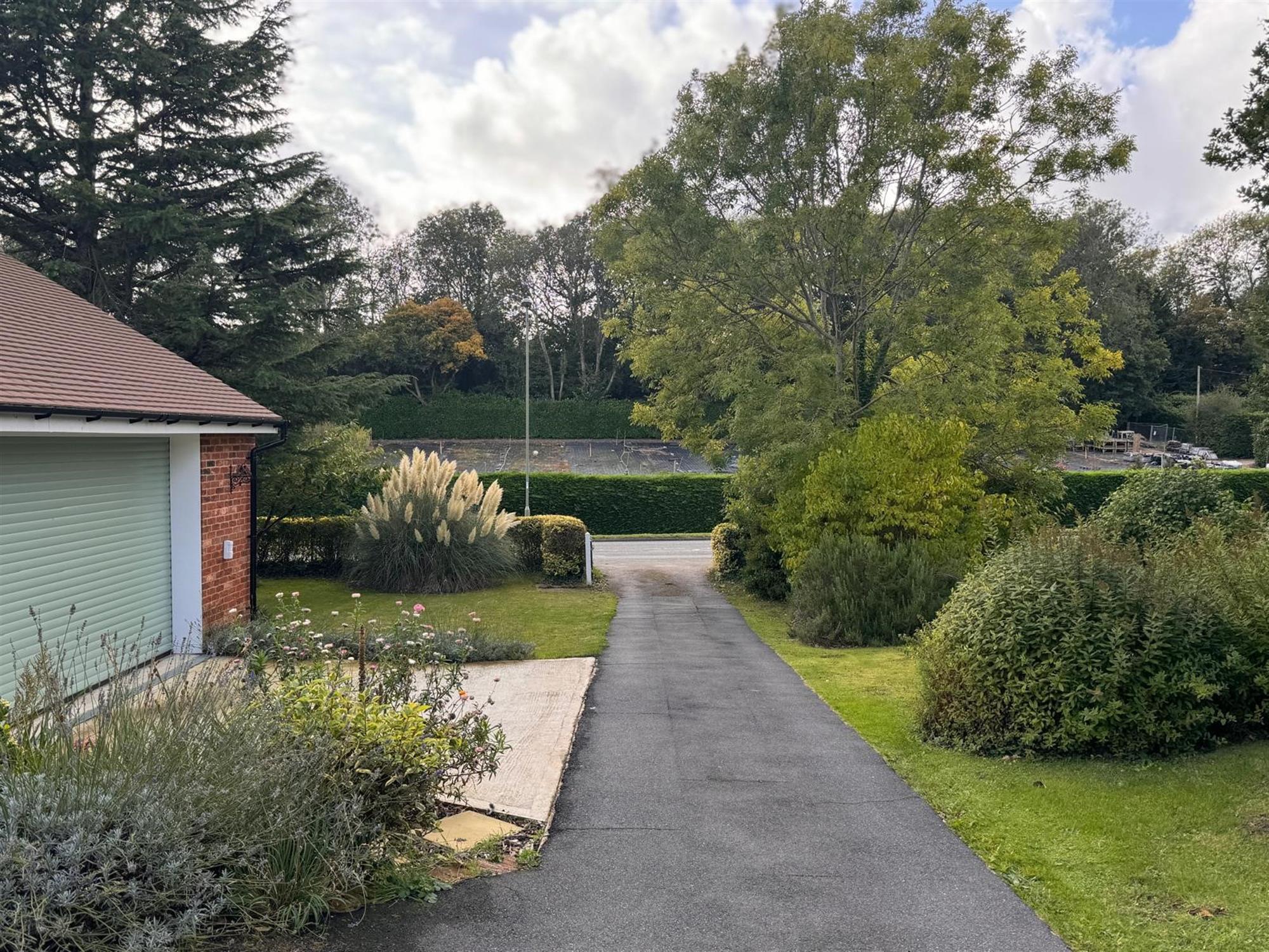 Long driveway past the bespoke double garage, established hedging and mature shrubs bordering flower beds leading up to the property, generous frontage offering parking for multiple vehicles.