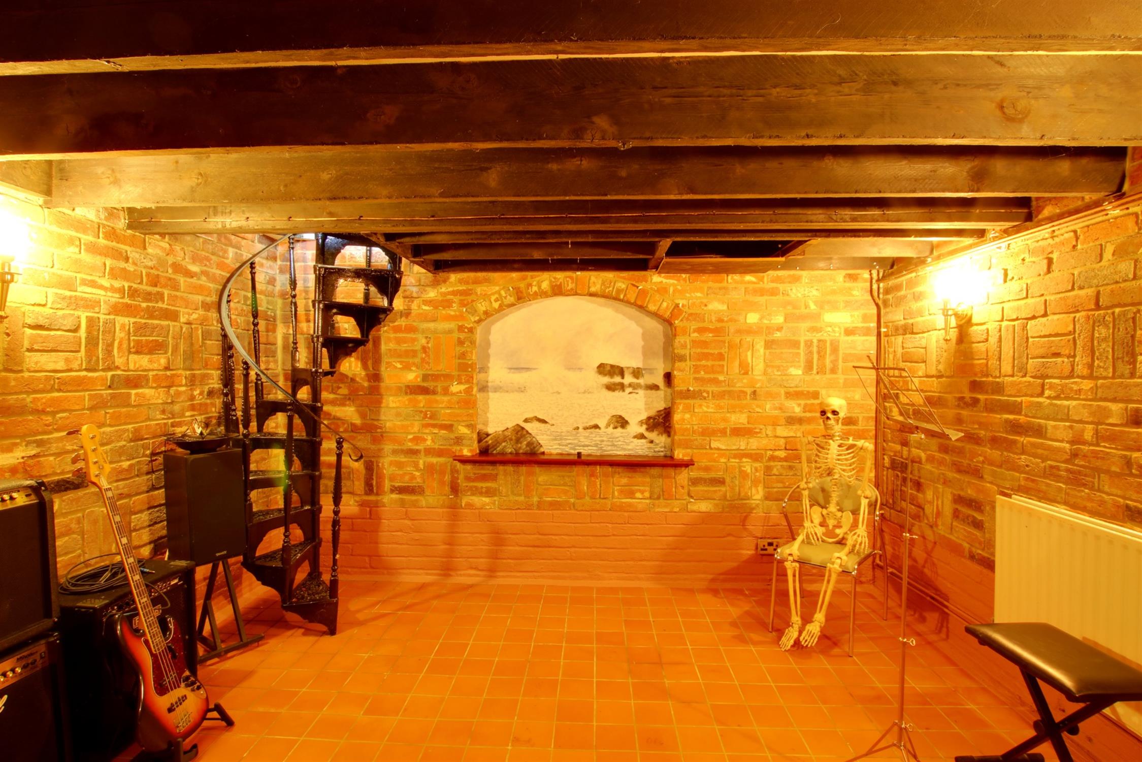 A great space as a music/games room and wine storage. Attractive exposed brick walls, beamed ceiling, tiled floor and radiator.