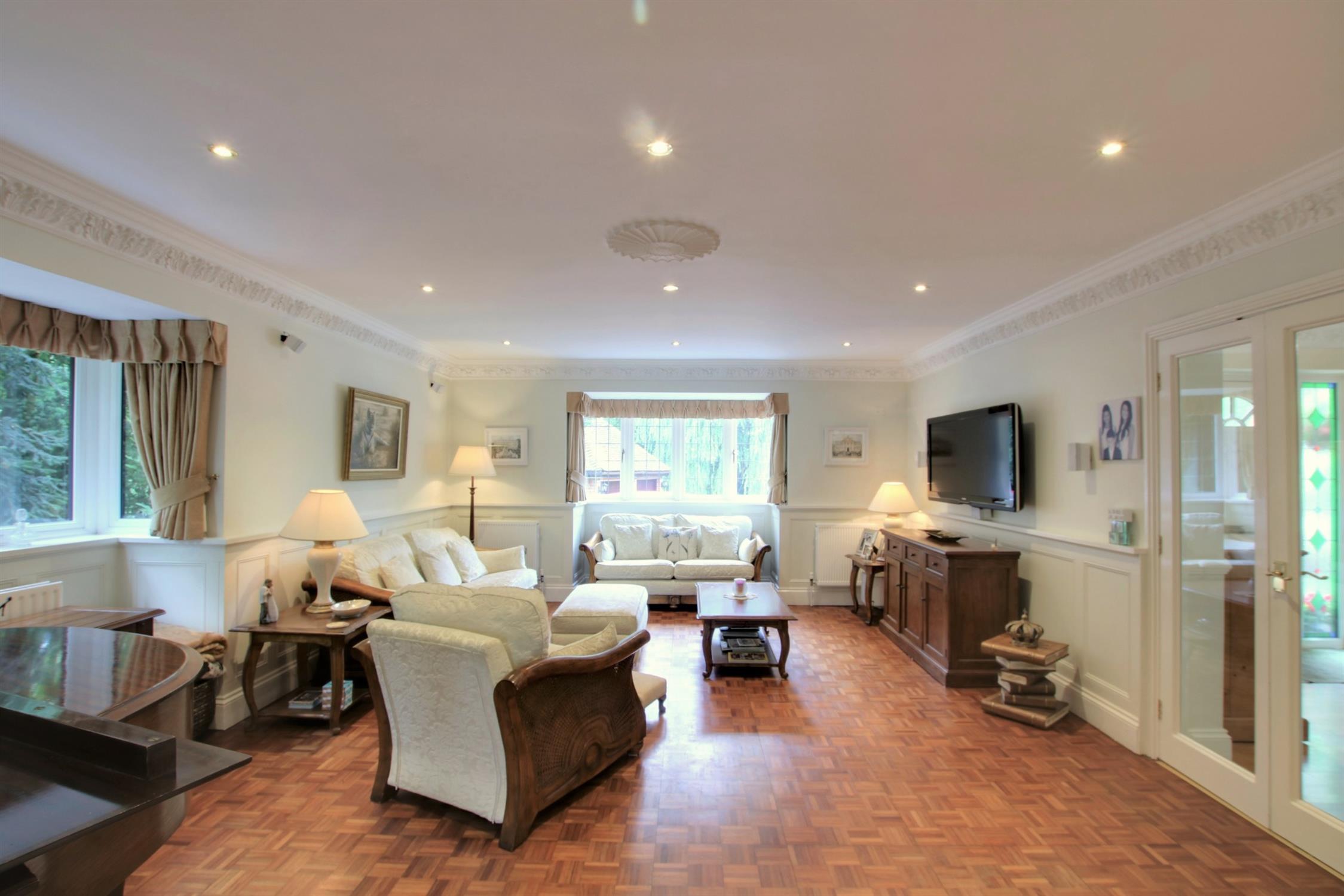 Super size drawing/family room with an attractive double glazed bay window to the front aspect and double glazed bay window to the side aspect. Ornate coving and ceiling rose. Inset lighting. Three radiators. Parquet flooring. Double opening doors to the sitting room and into the entrance hall.