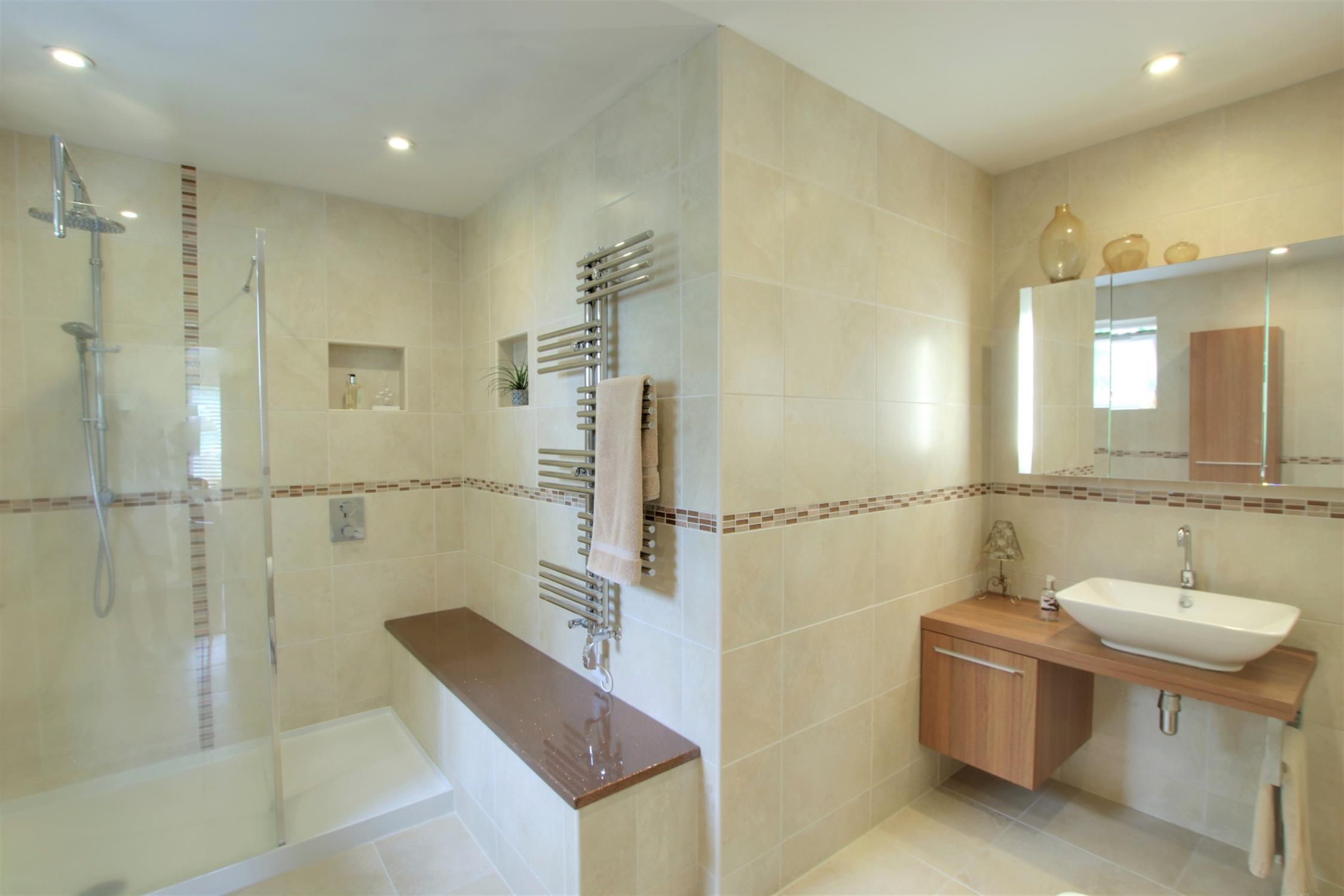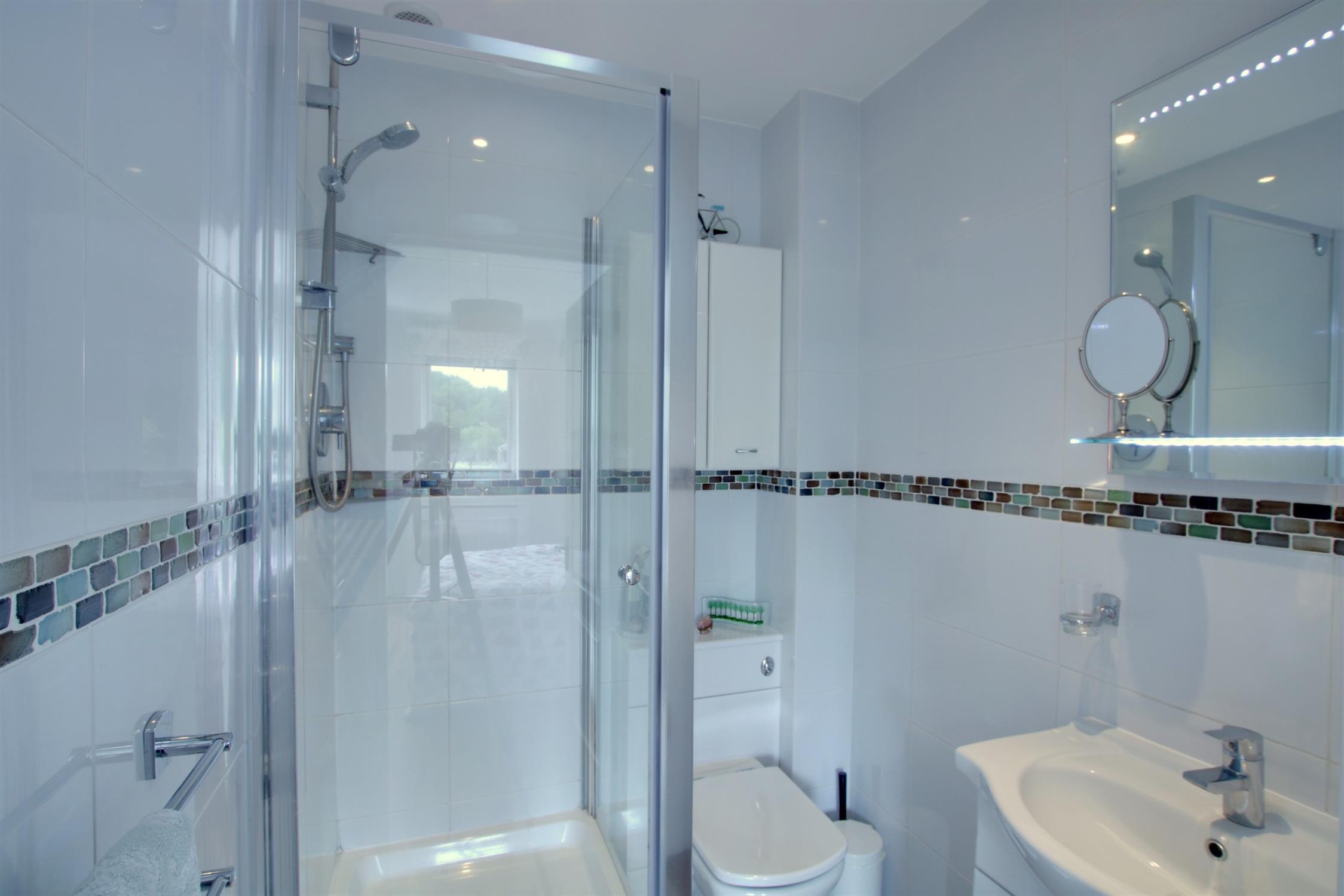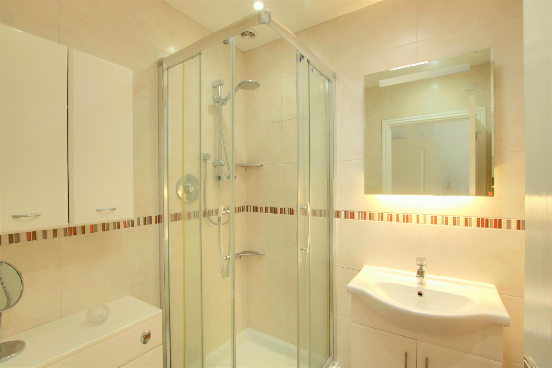 Tiled and fitted with a shower cubicle, wash hand basin with vanity cupboard beneath mirror and lighting over. Enclosed cistern wc with bathroom cabinet over. Inset lighting. Radiator.
