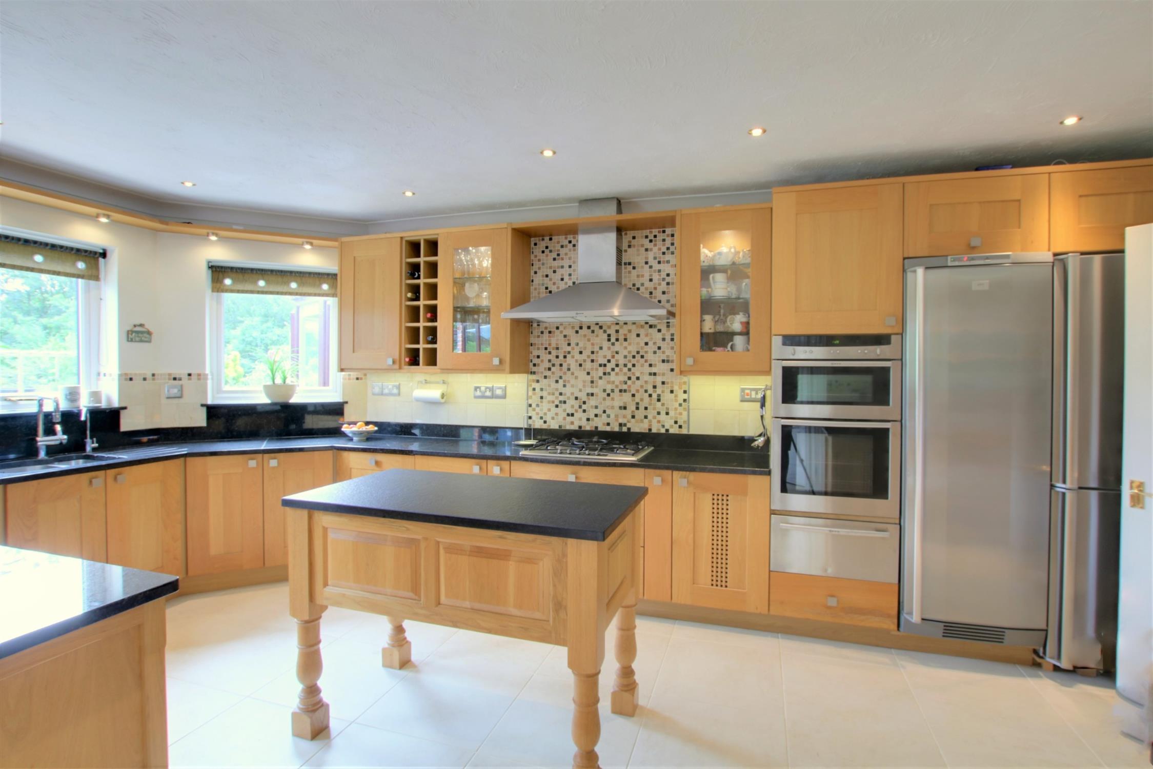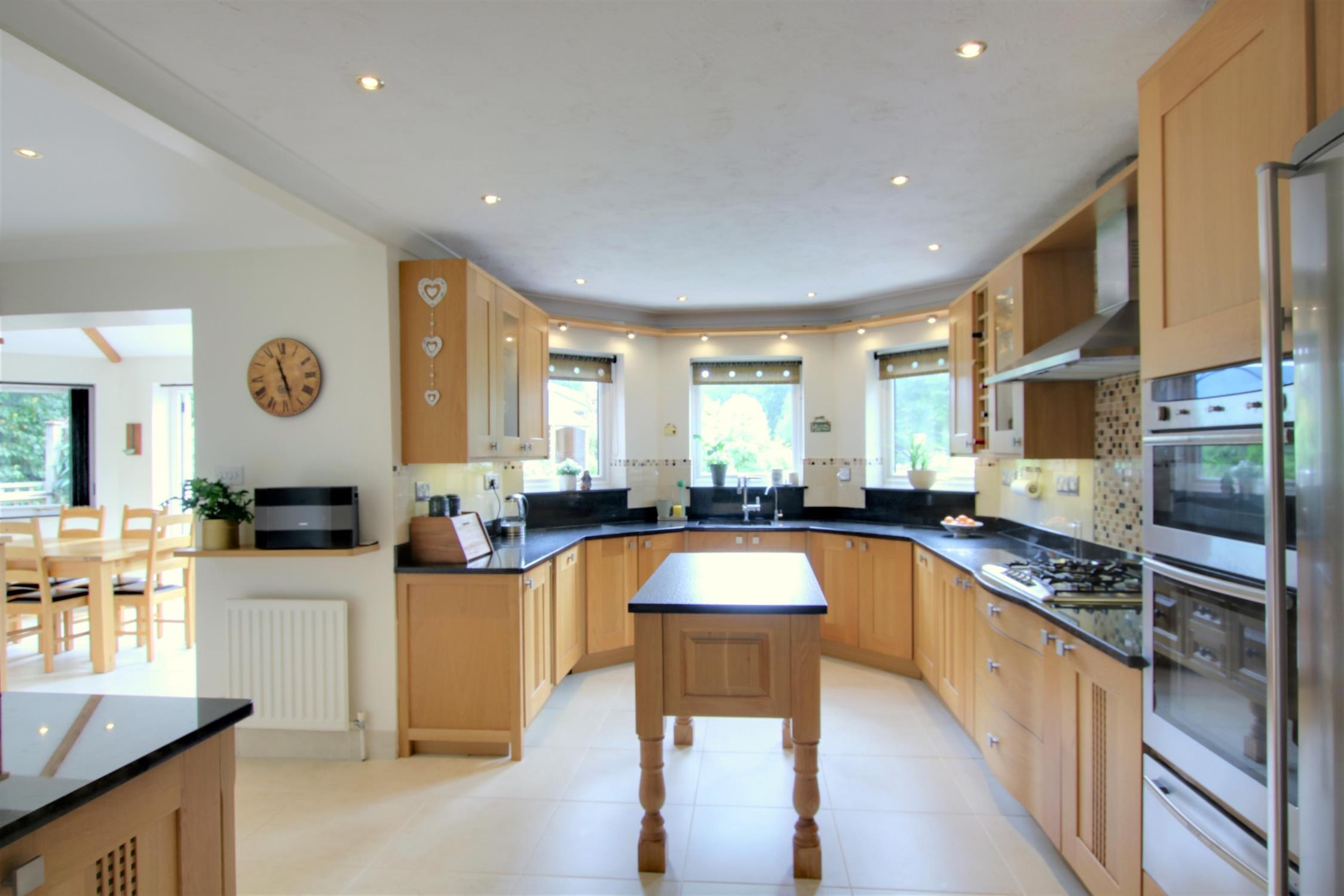 Superbly fitted with a range of base cupboard, drawer and wall units. One and a half bowl sink with mixer tap, additional filtered water tap and waste disposal unit. Oven housing with built in Neff double oven and warming drawer. Five ring gas hob with extractor over. Built in microwave and dishwasher. Spaces for fridge/freezer. Tiling. Built in larder with storage space and shelving. Over worktop lighting and Inset ceiling lighting. Three double glazed windows overlooking the rear garden. Radiator. Tiled floor. Opening to: