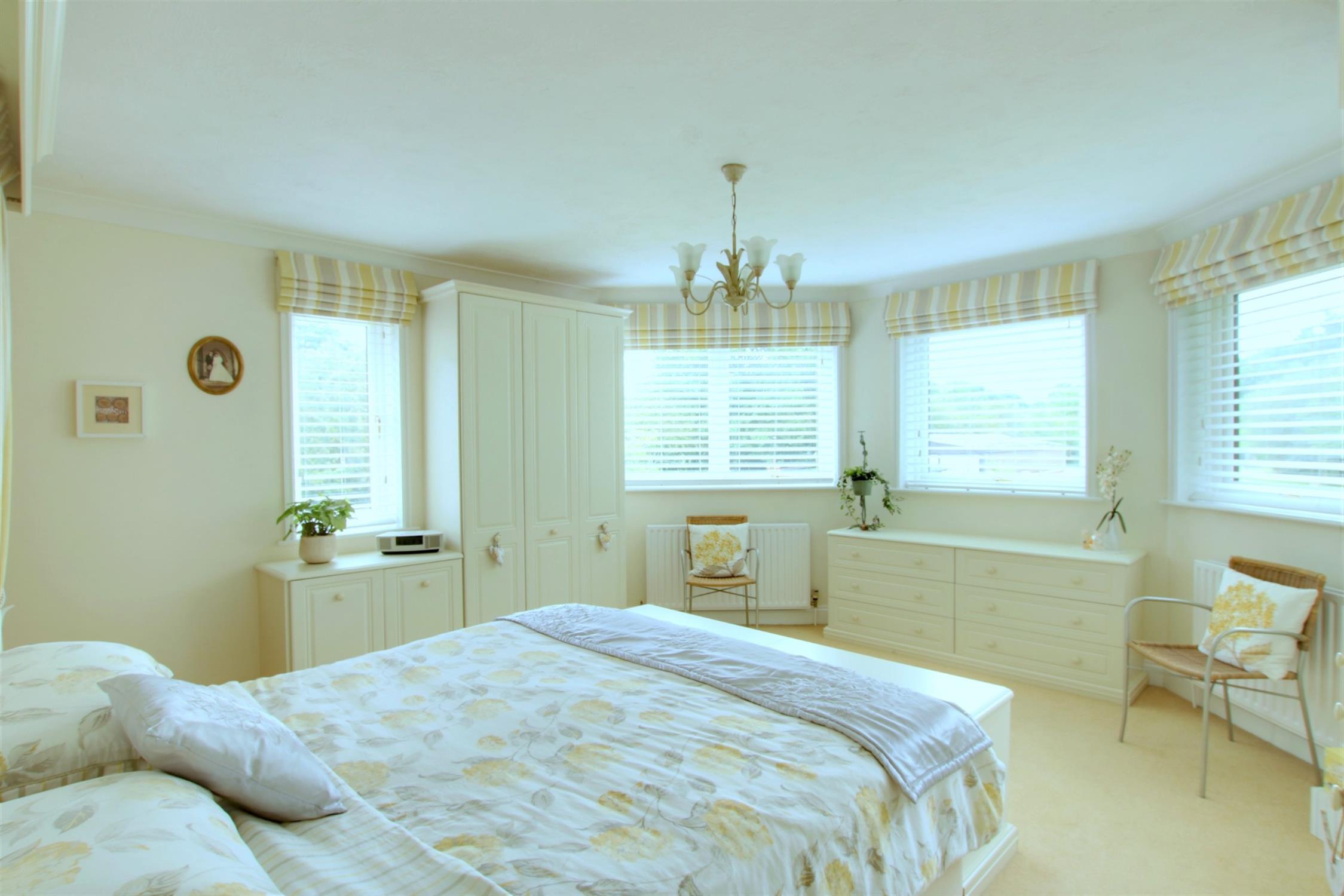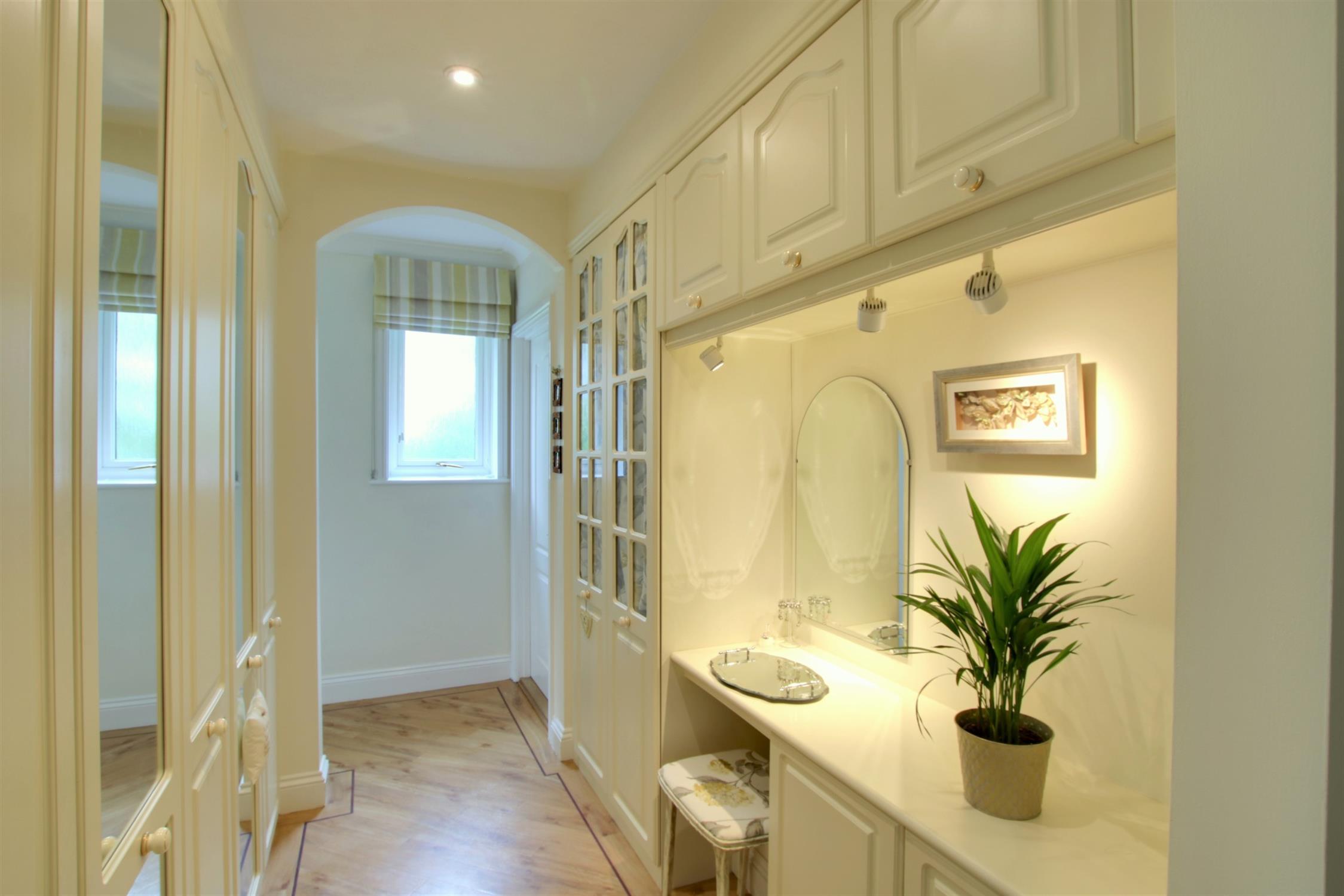 A fabulous master suite with four double glazed windows overlooking the extensive gardens, together with fitted bedroom furniture and wardrobes. Two radiators. Opening to the fitted DRESSING ROOM, with a range of wardrobes, storage cupboards, and dressing table with lighting over. Karndean flooring.