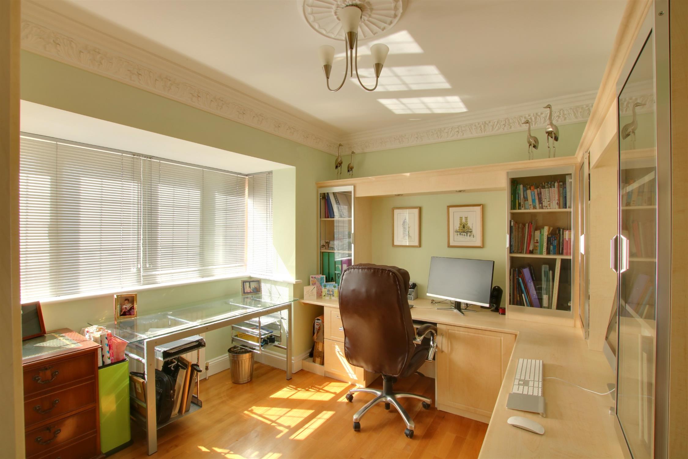 Fitted with a bespoke range of study furniture. Ornate coving and ceiling rose. Double glazed bay window to the front aspect. Radiator. Wood flooring.