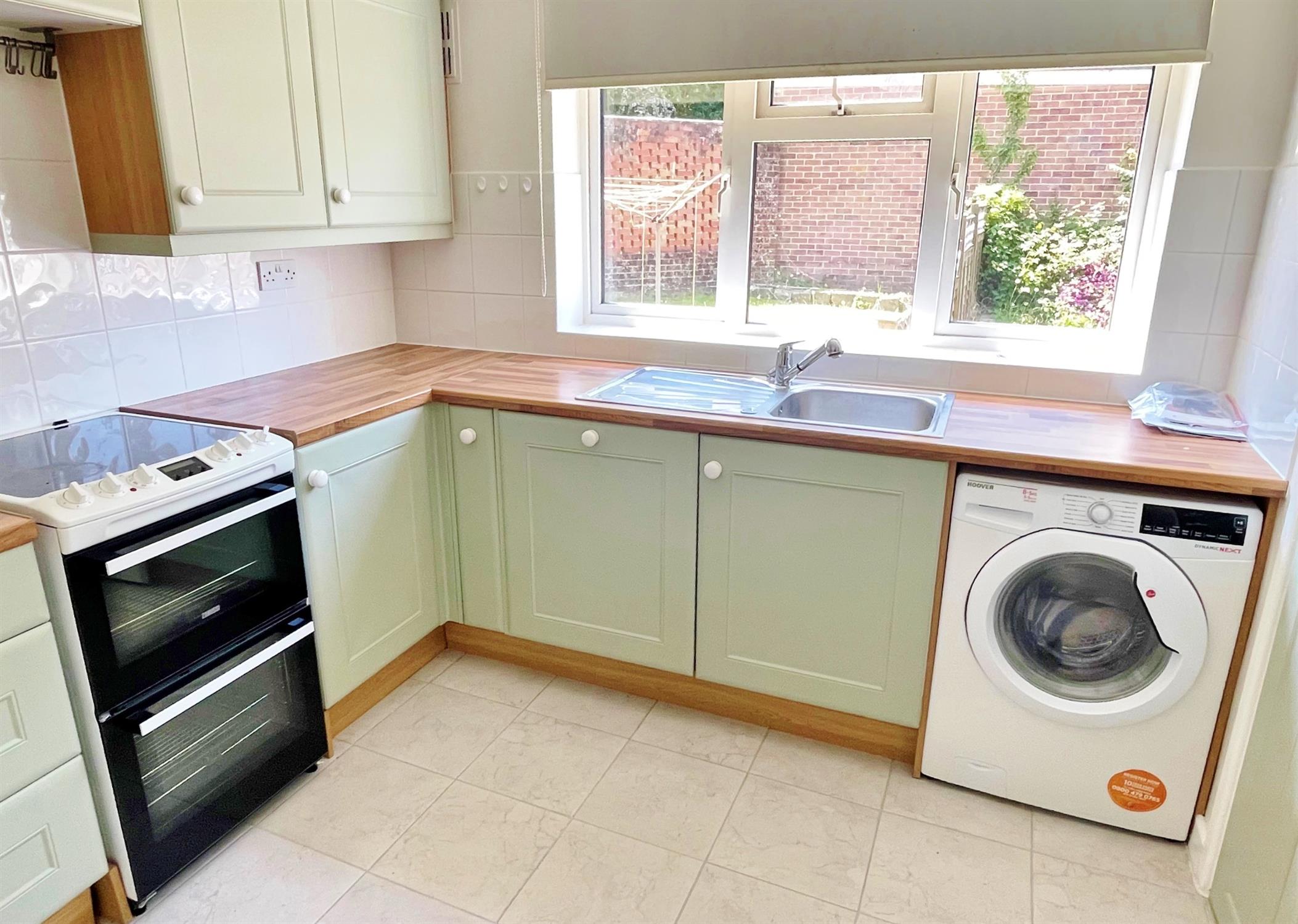 Window to rear. Range of wall and base units with working surfaces over. Single drainer stainless sink unit. Tiled splashbacks. Space for cooker. Space and plumbing for washing machine. Space for fridge freezer. Built-in larder cupboard. Tiled flooring.