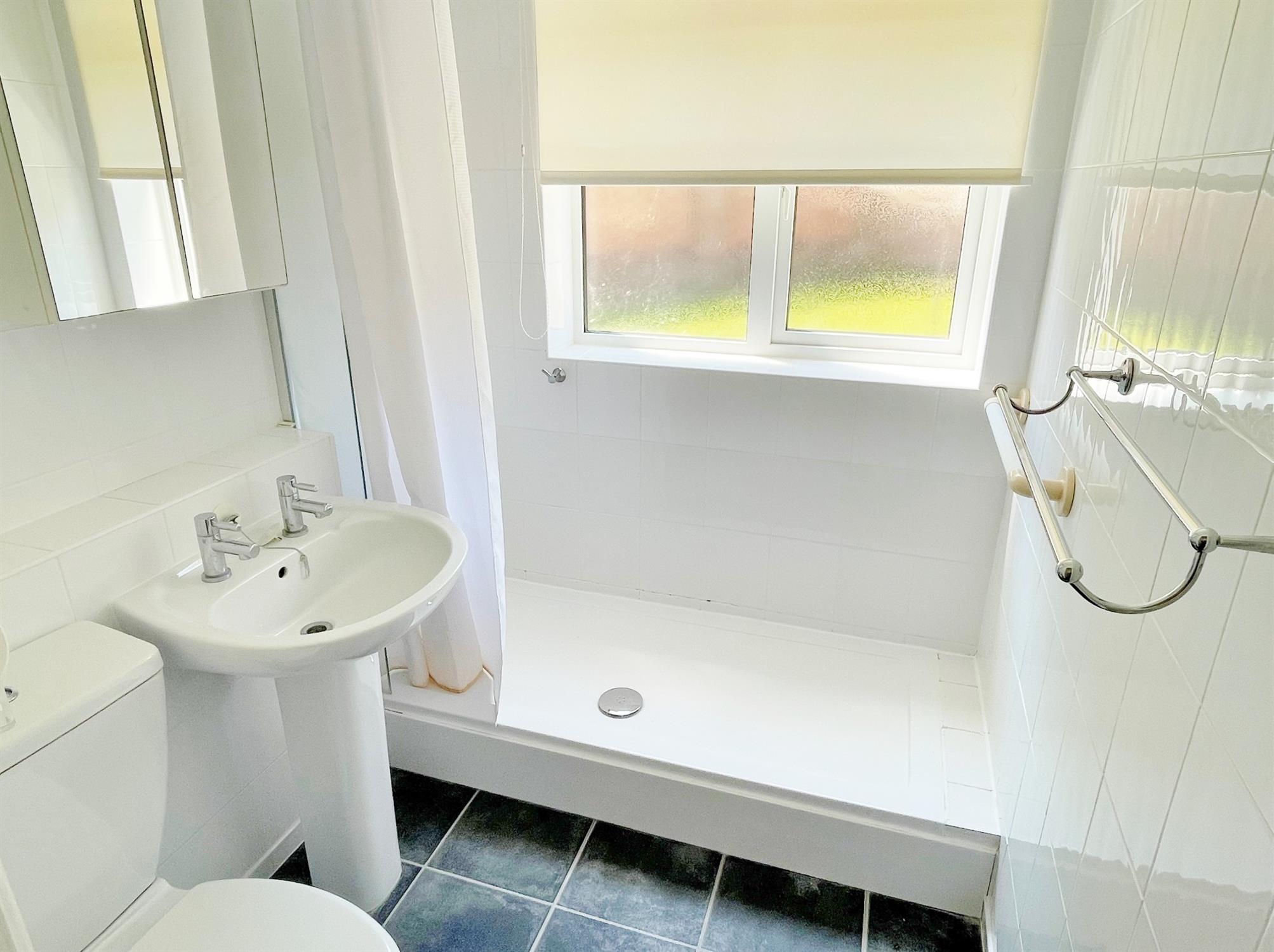Window to rear. Pedestal wash hand basin. Low-level WC. Shower unit with shower connected. Fully tiled.