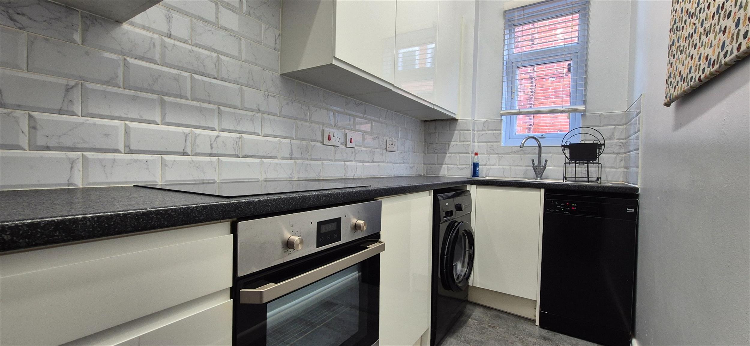 A range of white gloss wall and base units with a window to the side. Appliances consist of an electric hob and oven, a slimline dishwasher, a washing machine and a fridge/freezer.