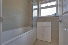 Panelled bath with screen and shower attachment. WC. Ceramic sink with cupboard under. Heated towel rail. Tiled flooring. Frosted double glazed window.