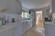 A range of wall and base cupboards with quartz work surface over. Range style oven. Integrated dishwasher and microwave. Butler sink with drainer. Tiled flooring. Double glazed window.