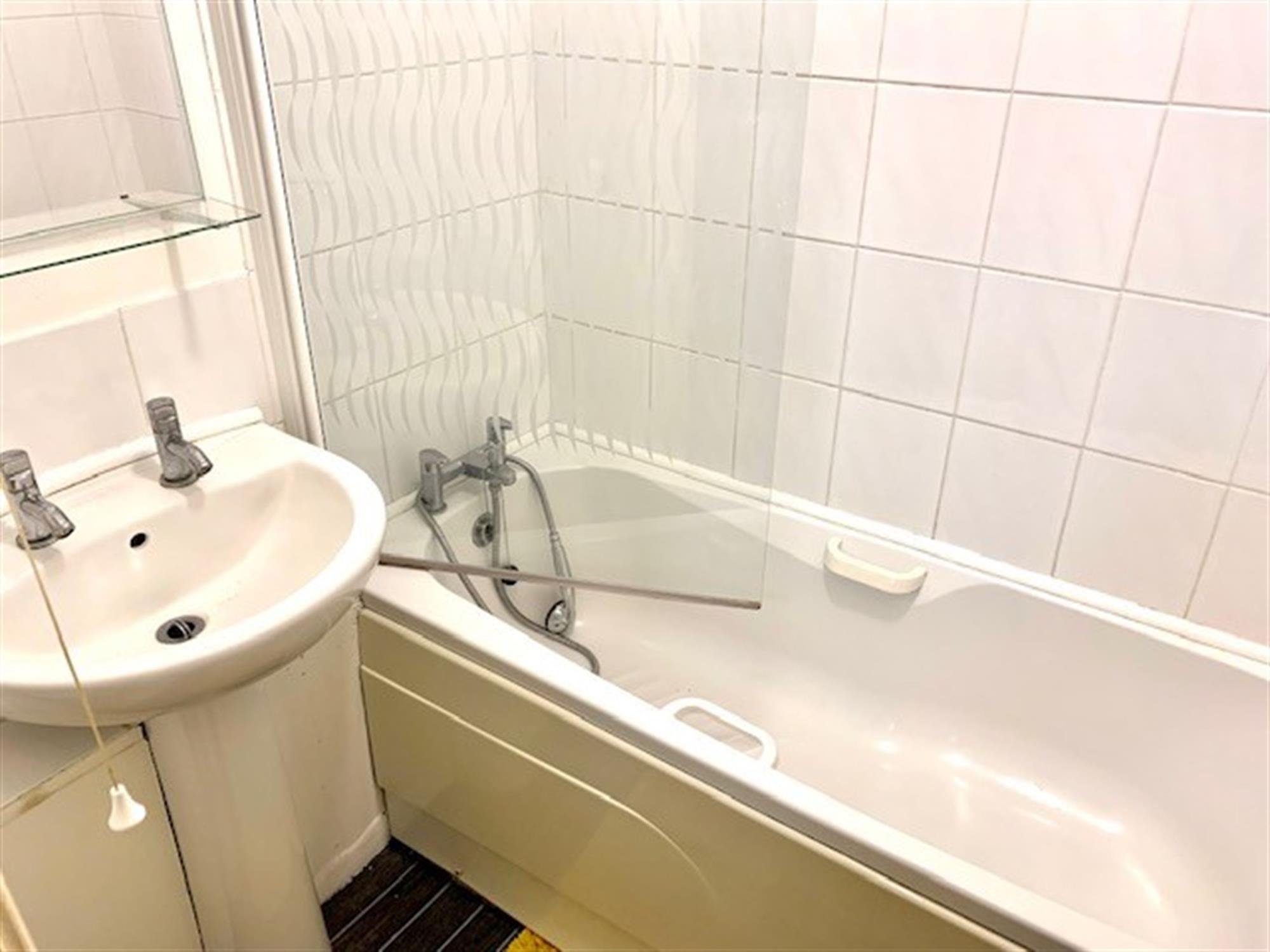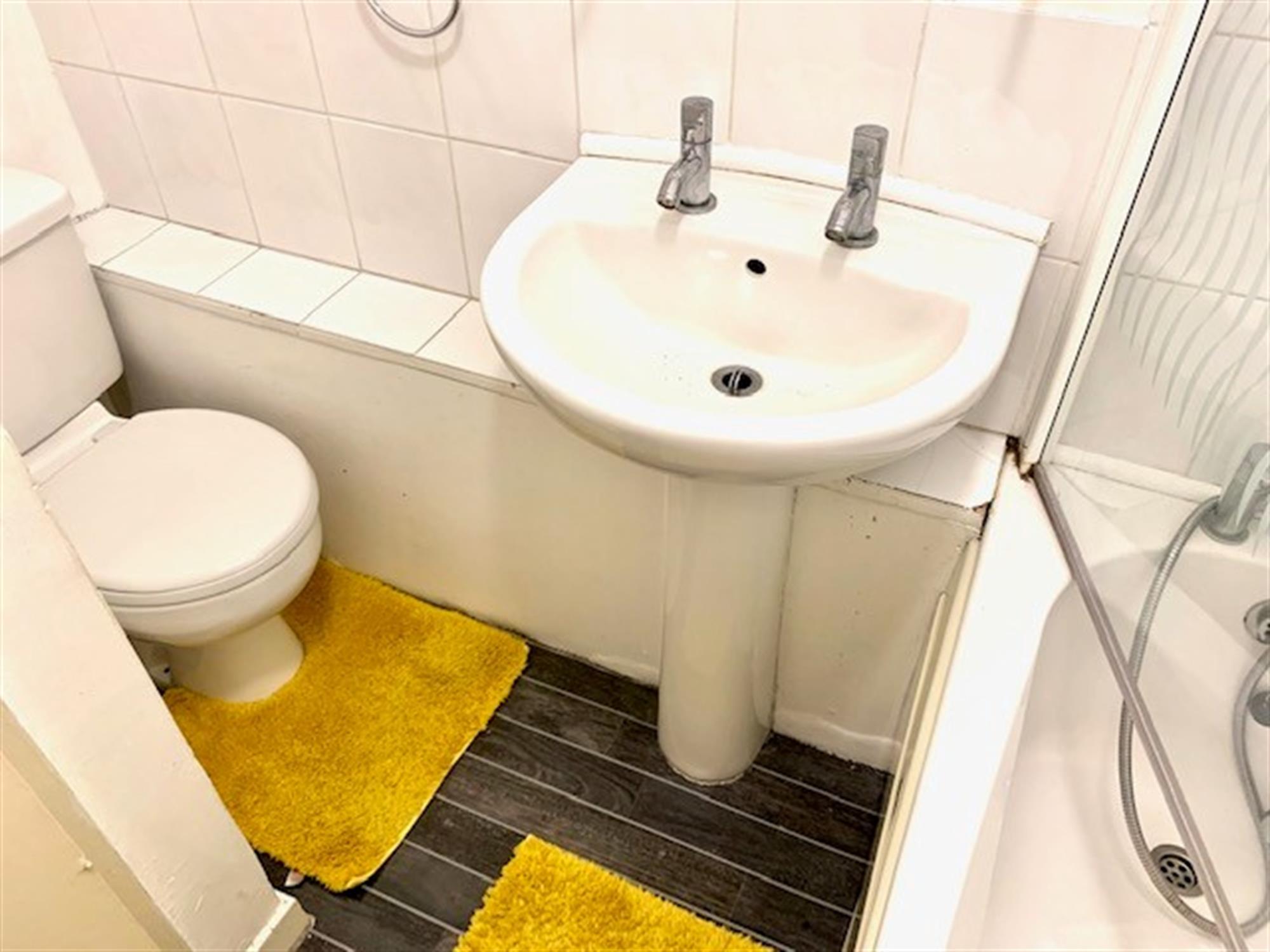 BATHROOM - White suite bathroom with shower over bath, sink and toilet.