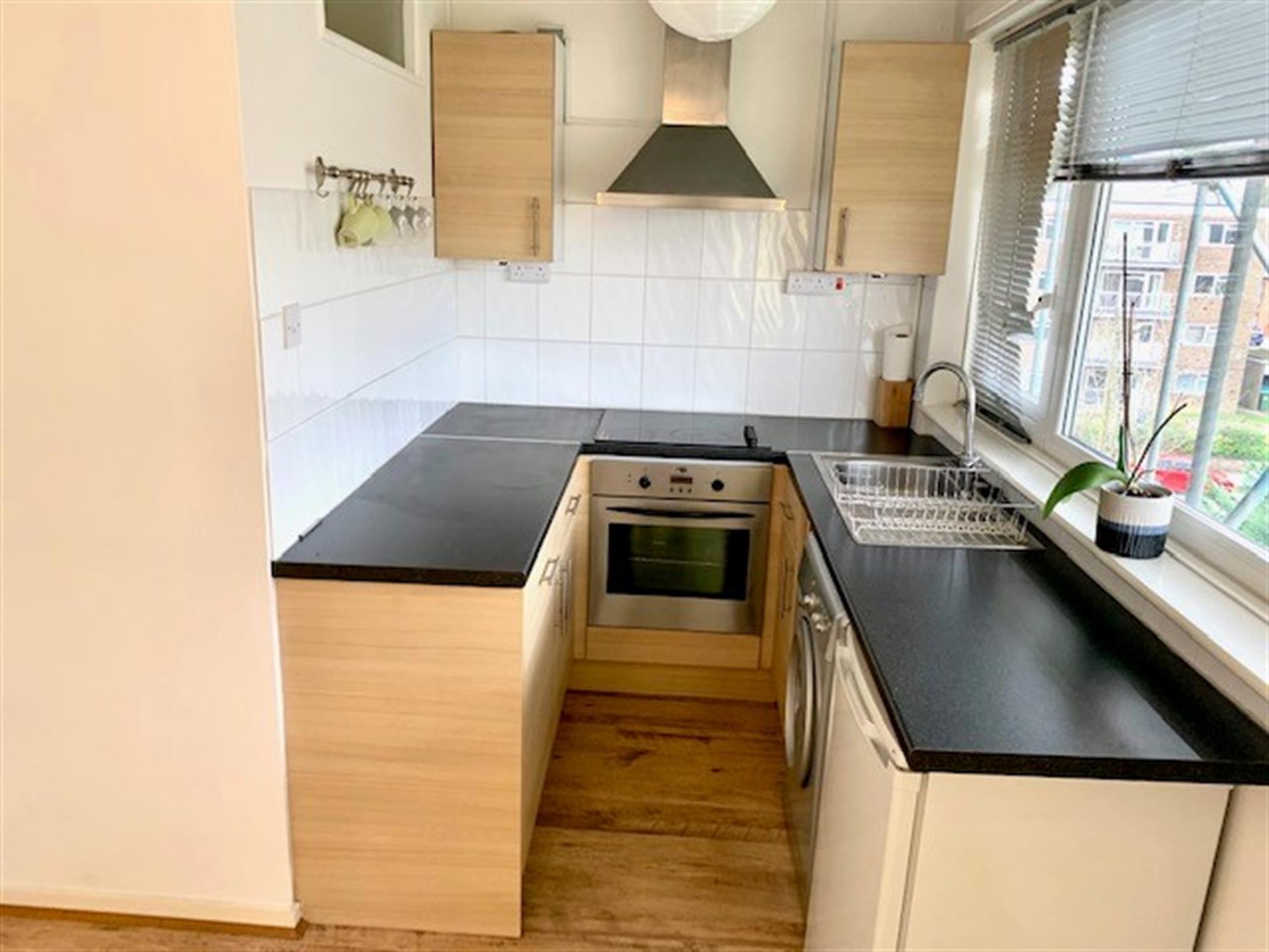 KITCHEN - Fitted kitchen incorporating electric hob, washer/dryer, fridge with small freezer compartment. Window overlooking the communal garden.