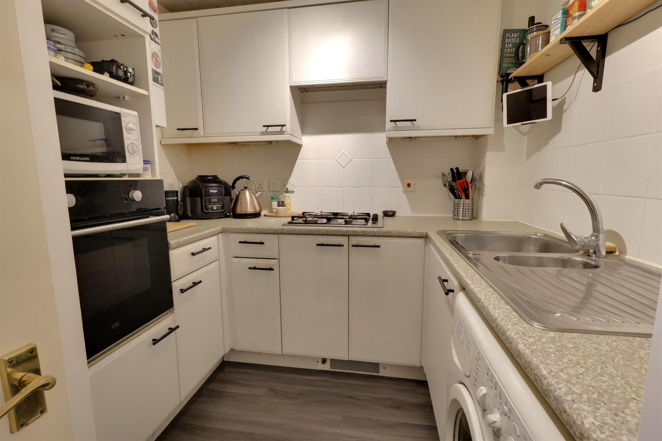 Laminate flooring. Tiled splashback. Matching wall and base units. Integrated gas hob and fan oven with extractor. Space for washing machine and fridge freezer. Wall mounted combination boiler.