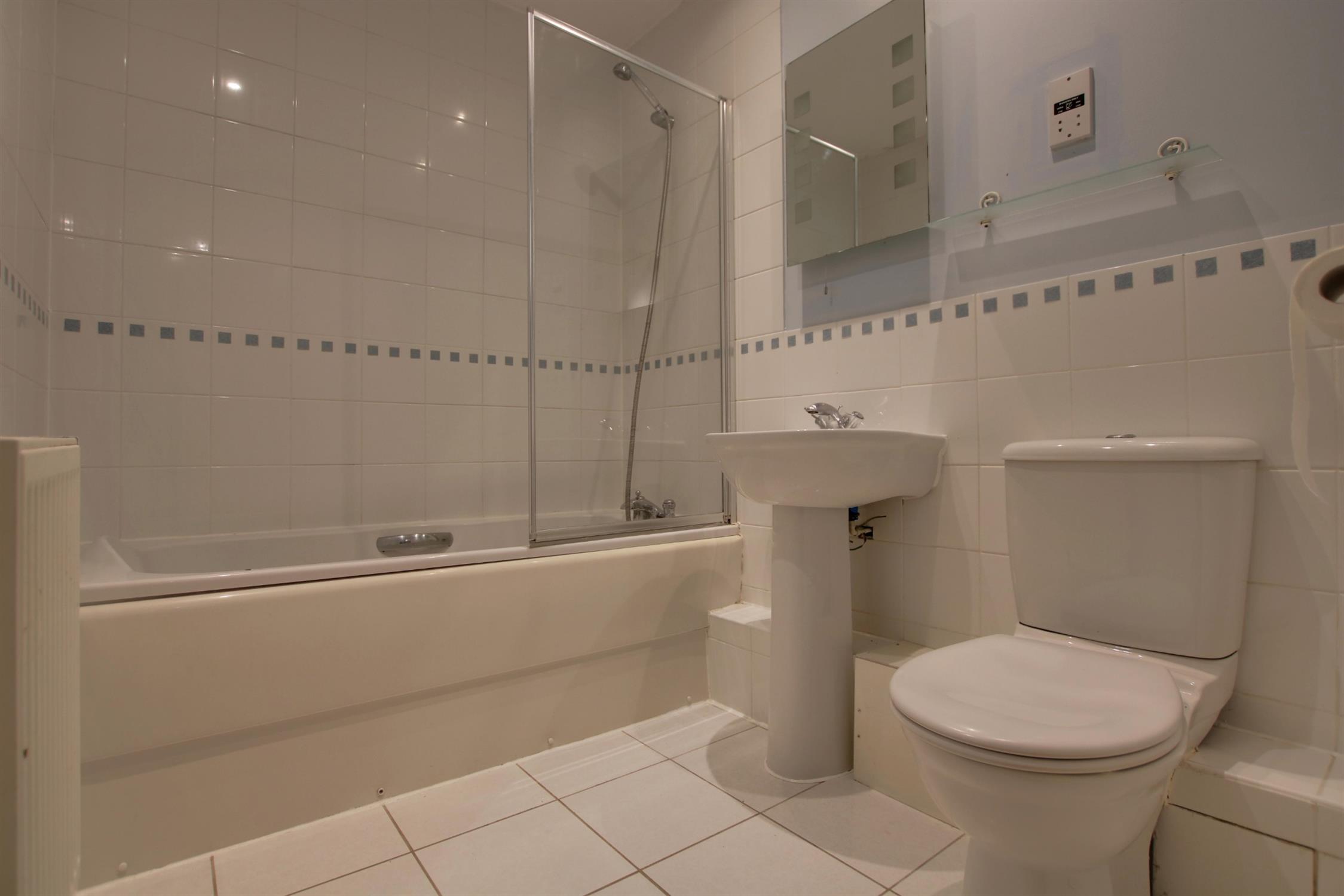 White wall and floor tiling. Panelled bath with glass shower screen and mixer tap shower head over, ceramic wash basin and w.c. Radiator. Smooth walls and ceiling. Extractor fan. Shaver socket.