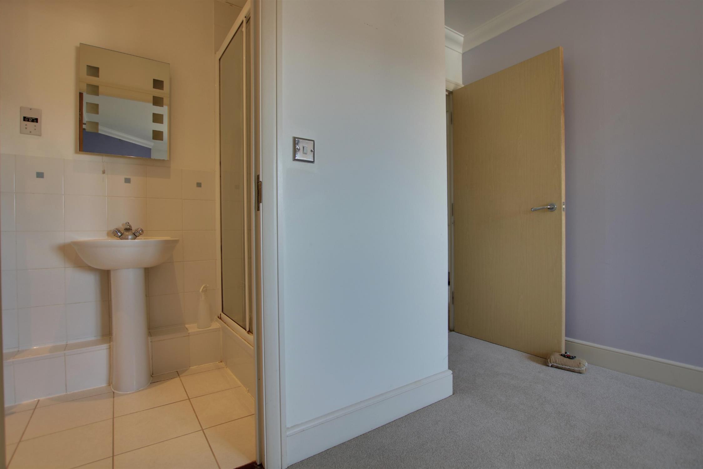 White wall and floor tiling. Raised shower cubicle with glass sliding door and bar valve shower unit, ceramic wash basin and w.c. Radiator. Smooth walls and ceiling with inset spotlights. Extractor fan. Shaver socket.