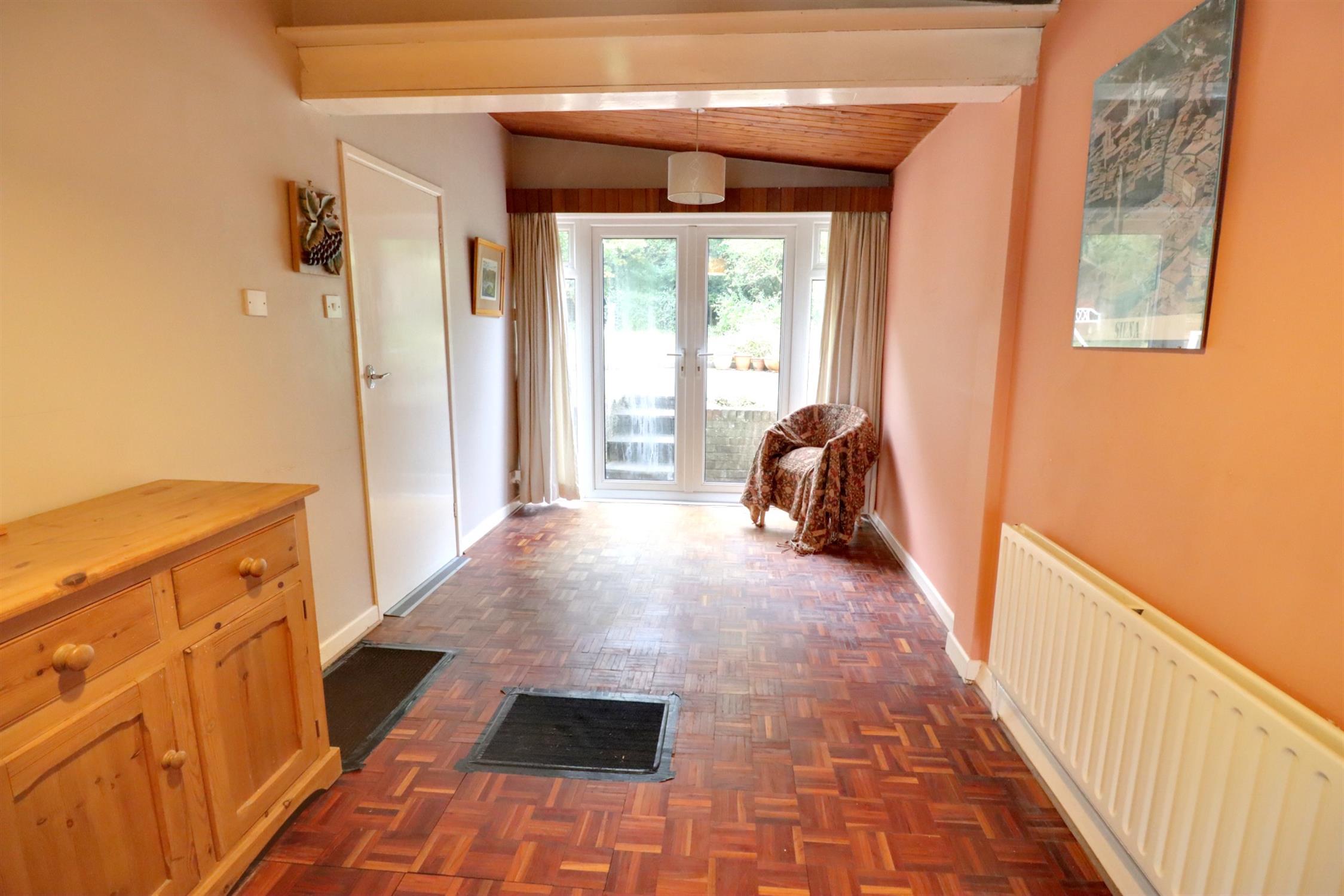 Radiator, rear aspect double glazed French doors with double glazed side panels leading to the rear garden, parquet flooring, door to the kitchen/breakfast room.
