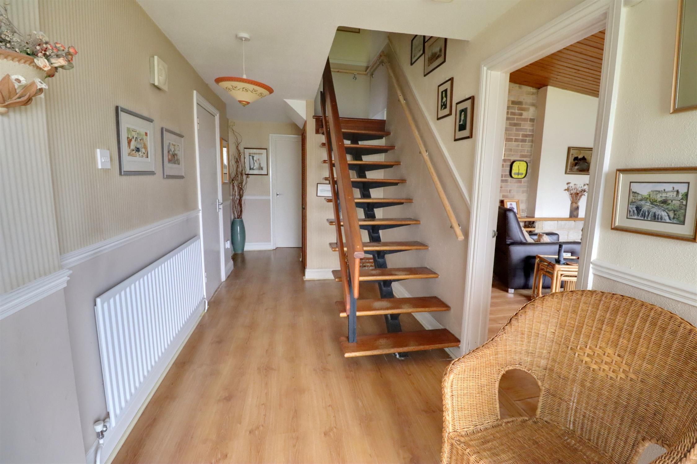 Via double glazed front door with double glazed side panel, radiator, doors to the lounge, kitchen/breakfast room, bathroom, bedroom three and garage, stairs to the first floor, built in storage cupboard, laminate flooring.