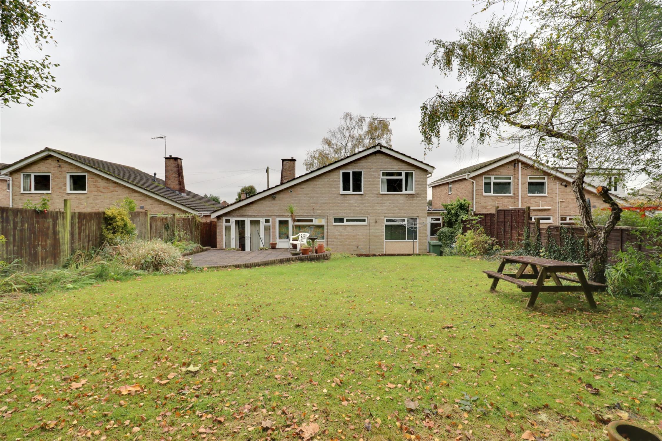 Offering a high degree of privacy backing onto woods, a well proportioned space enclosed by fence raised patio and lawns with a variety of mature shrubs, trees and borders, outside tap.