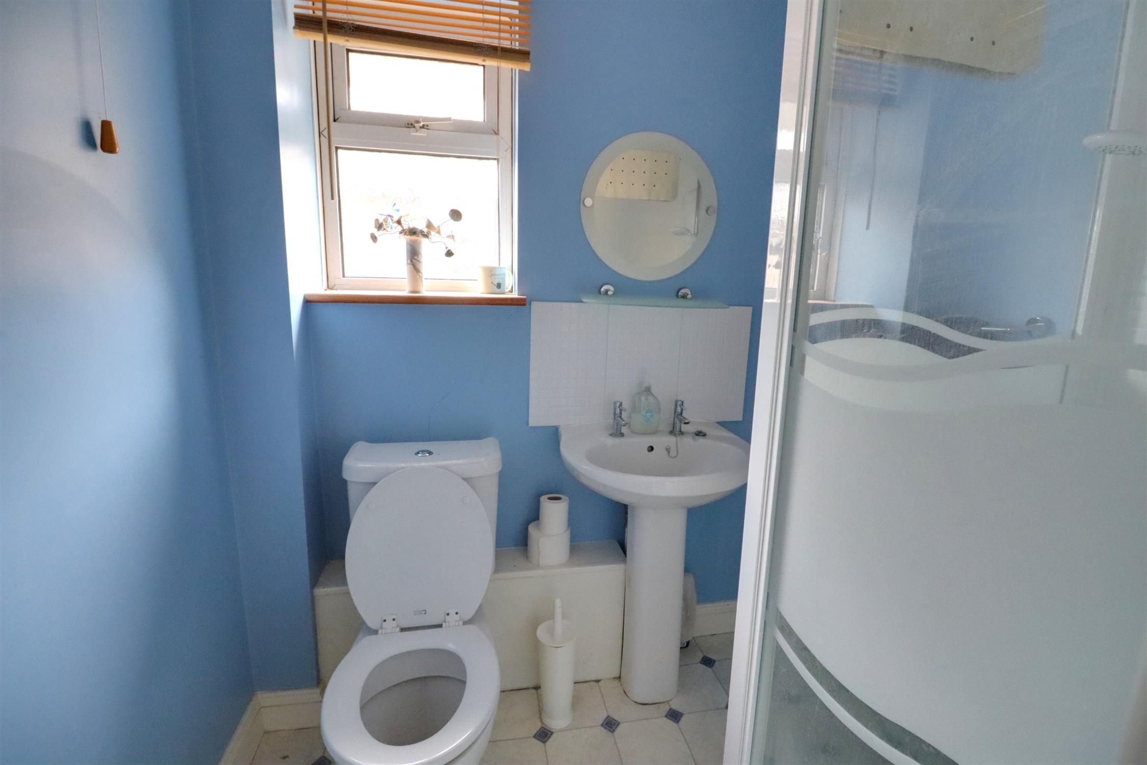 Shower cubicle, low level wc, wash basin in pedestal, side aspect double glazed window.