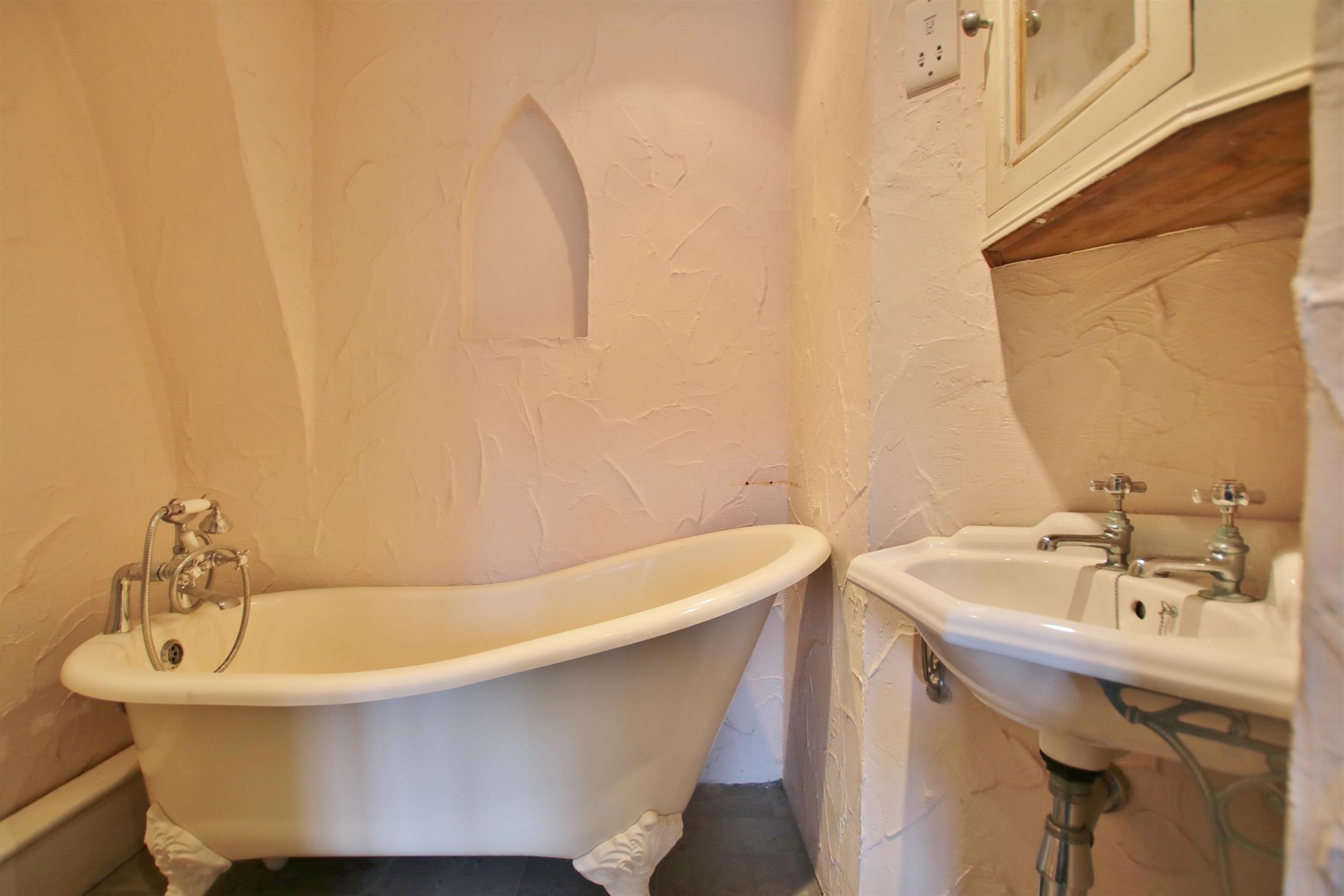 EN-SUITE - Smooth ceiling with inset spotlights, suite comprises, roll top bath with claw feet. Wash hand basin & low level W.C. Shaver point.