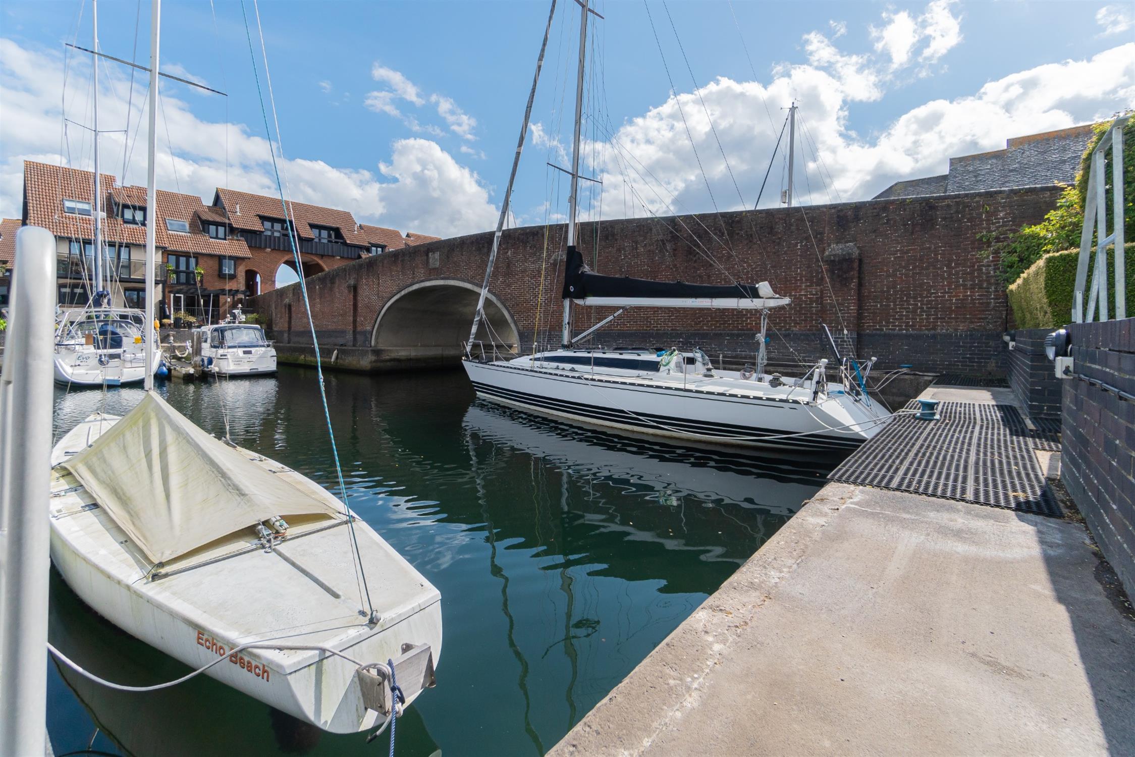 Electric door to front. Power and light connected. Range of units with space and plumbing for washing machine. One and a half bowl single drainer sink unit with cupboards below. Additional parking to the side with side access to the side and rear garden/ patio and pontoon.