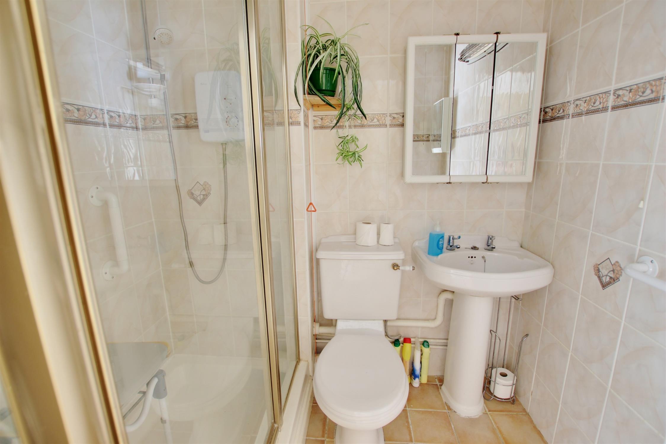 Three-piece suite comprising shower cubicle, pedestal wash hand basin and low level WC. Fully tiled walls and flooring. Wall mounted cupboard. Extractor fan. Emergency pull cord.