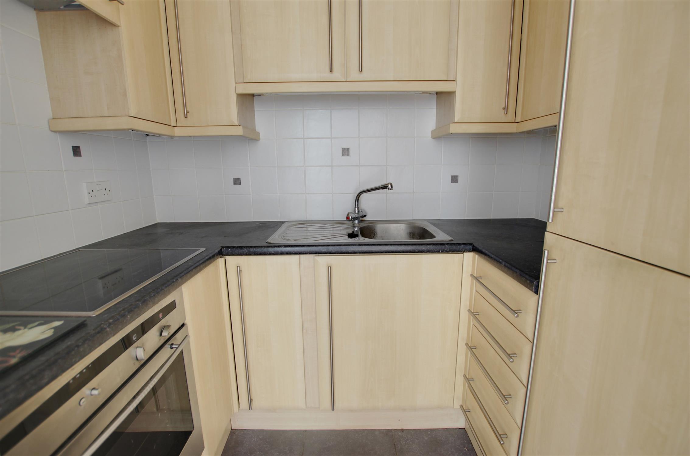 Modern kitchen with a range of base, wall and drawer units. Integrated fridge/freezer. Integrated electric Neff hob and oven with extractor fan. Stainless steel single bowl sink unit with drainer and mixer tap. Tiling to all walls.
