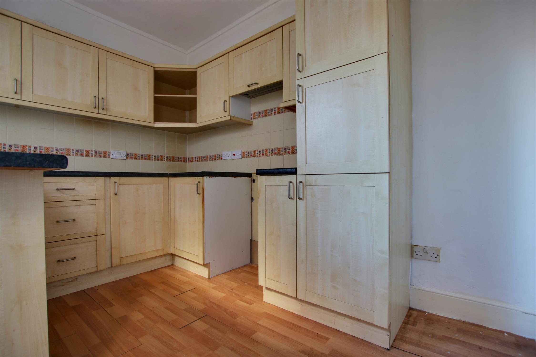 Laminate flooring. Matching wall and base units with worktop over. Sink and drainer. Space for tall standing fridge/freezer, oven and washing machine. Double glazed window to side. Tiled splash backs. Double glazed door to rear garden. Smooth walls and textured ceiling.