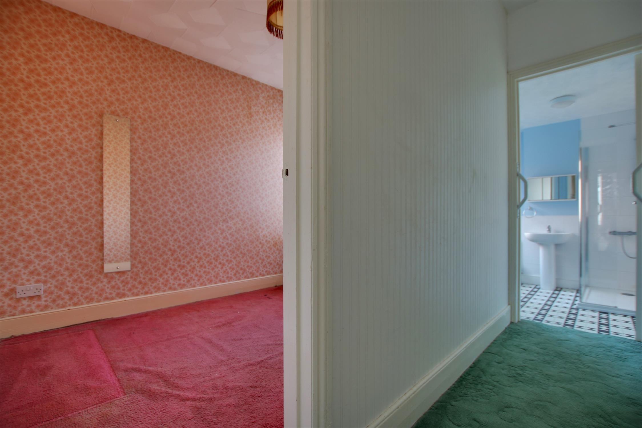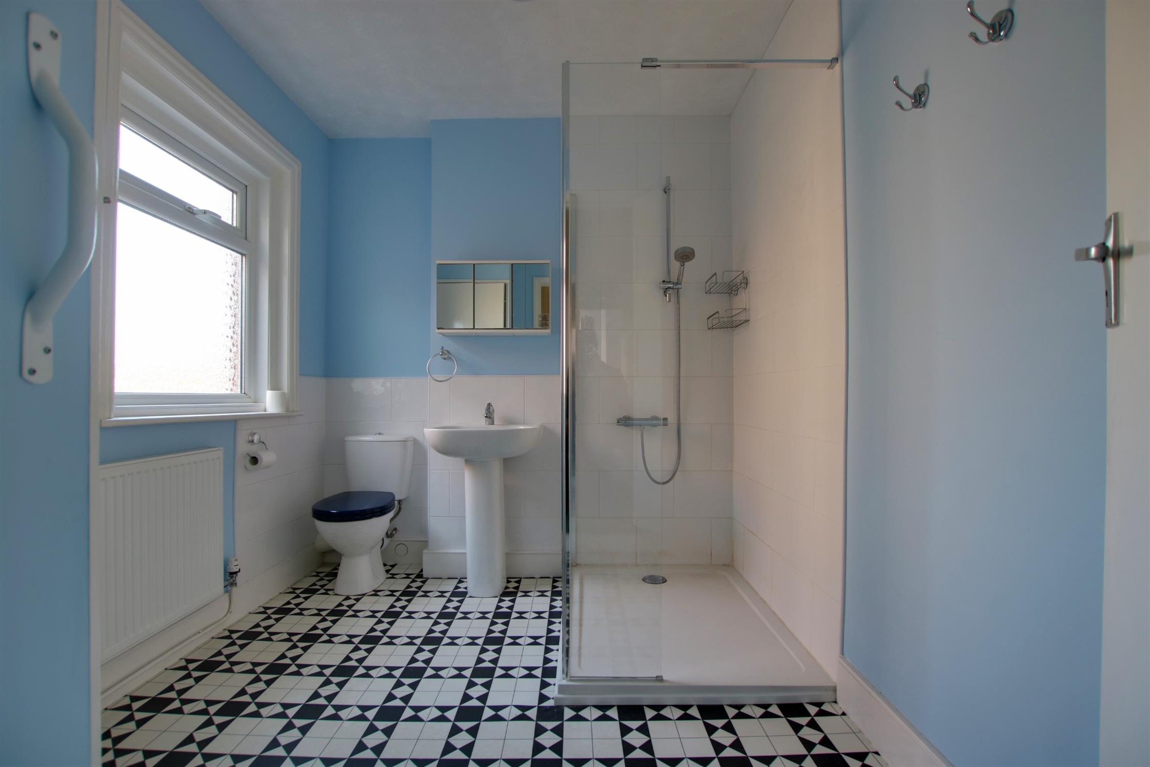 Vinyl flooring. Obscure double glazed window to side. Walk-in shower with valve shower unit, ceramic wash basin and w.c. Smooth walls and textured ceiling. Airing cupboard with boiler and tank within. Radiator.