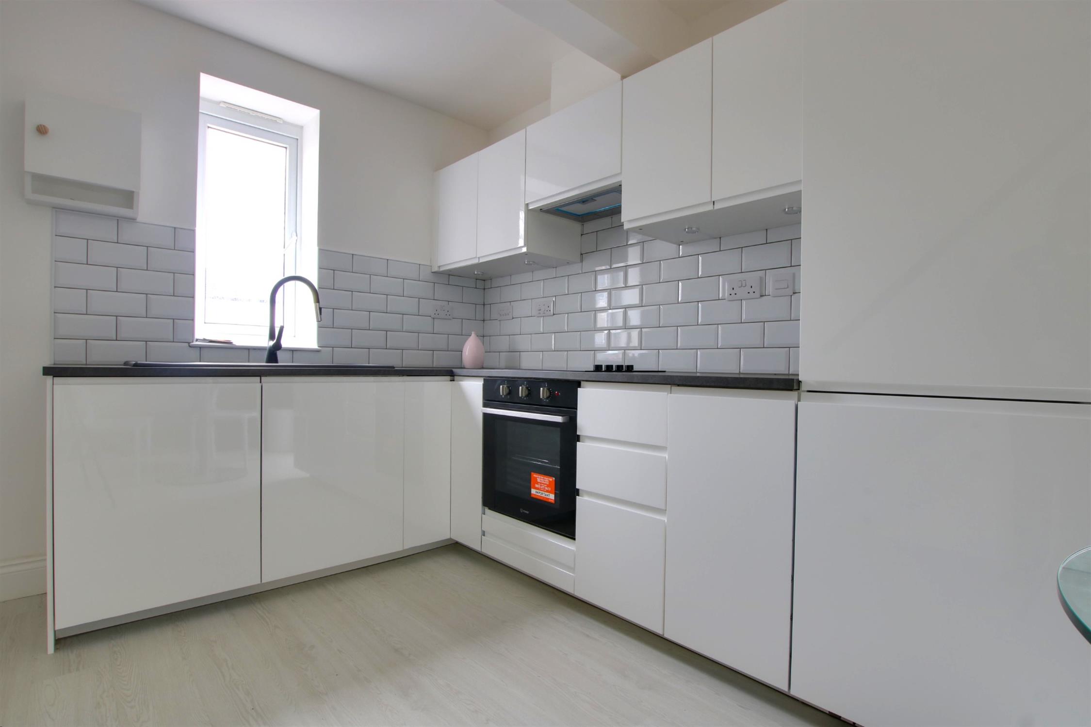 Brand new range of L-shaped eye and base level units finished in a contemporary style with contrasting work surfaces over. Integrated one and a half bowl single drainer sink unit with under lighting to the worktop surfaces as well as metro style tiled splash backs. A comprehensive range of integrated appliances to include electric oven and hob with extractor hood over, a generously proportioned fridge/freezer and integrated dishwasher. Situated beneath the stairs is a laundry style cupboard with a free-standing washer/dryer which will remain. There is also a wall mounted combination central heating boiler which is electrically powered. Stairs rising to first floor landing with a feature glass balustrade. The flooring is finished in a wood effect white wash flooring. Smooth plastered ceiling with light fittings.
