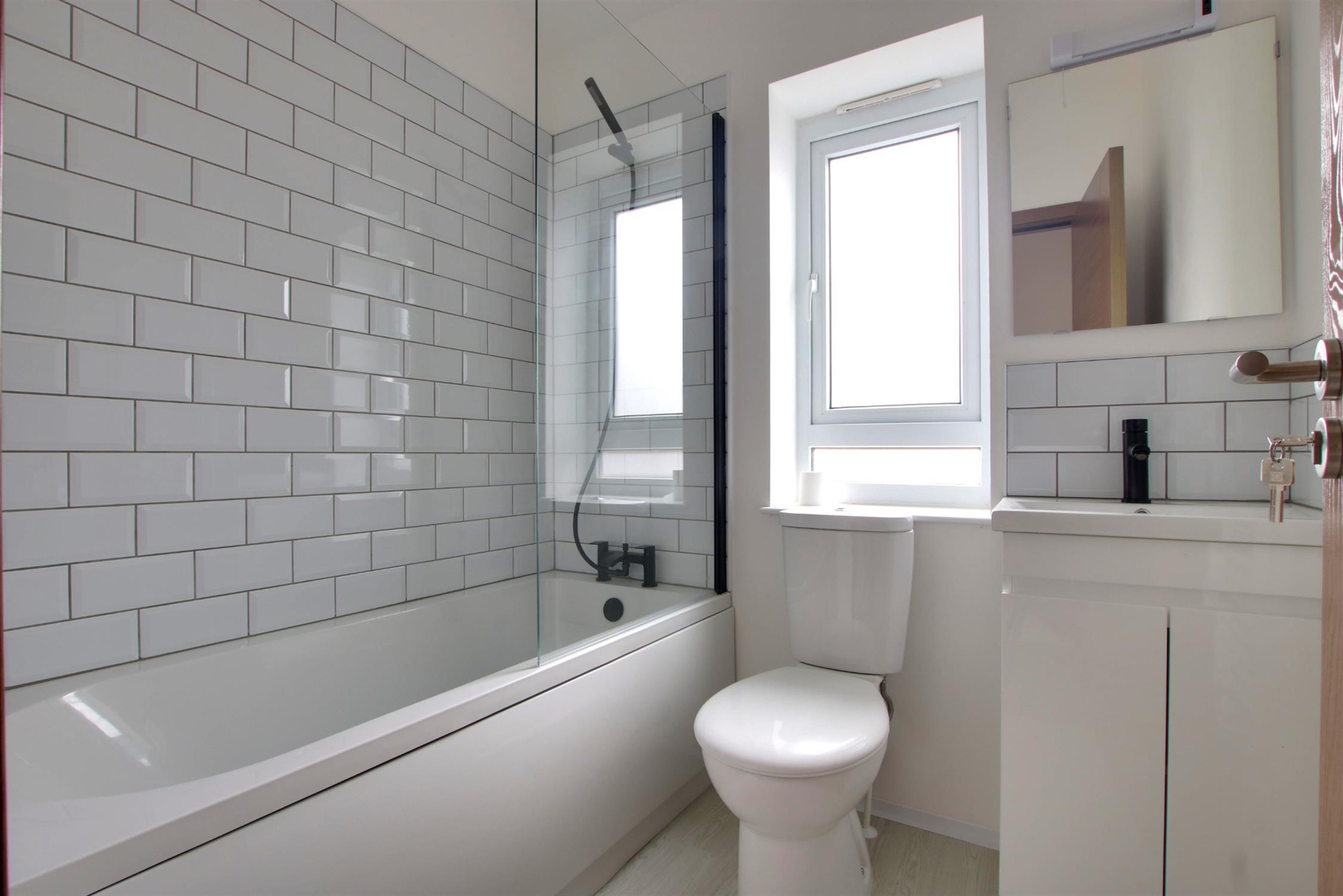 Panelled bath with mixer tap fitting and shower attachment, low level w.c. and vanity hand basin. Chrome finish ladder style towel rail. Double glazed window. Extractor fan. Partly tiled wall surfaces with a metro style tile. Double glazed window. Fitted mirror.