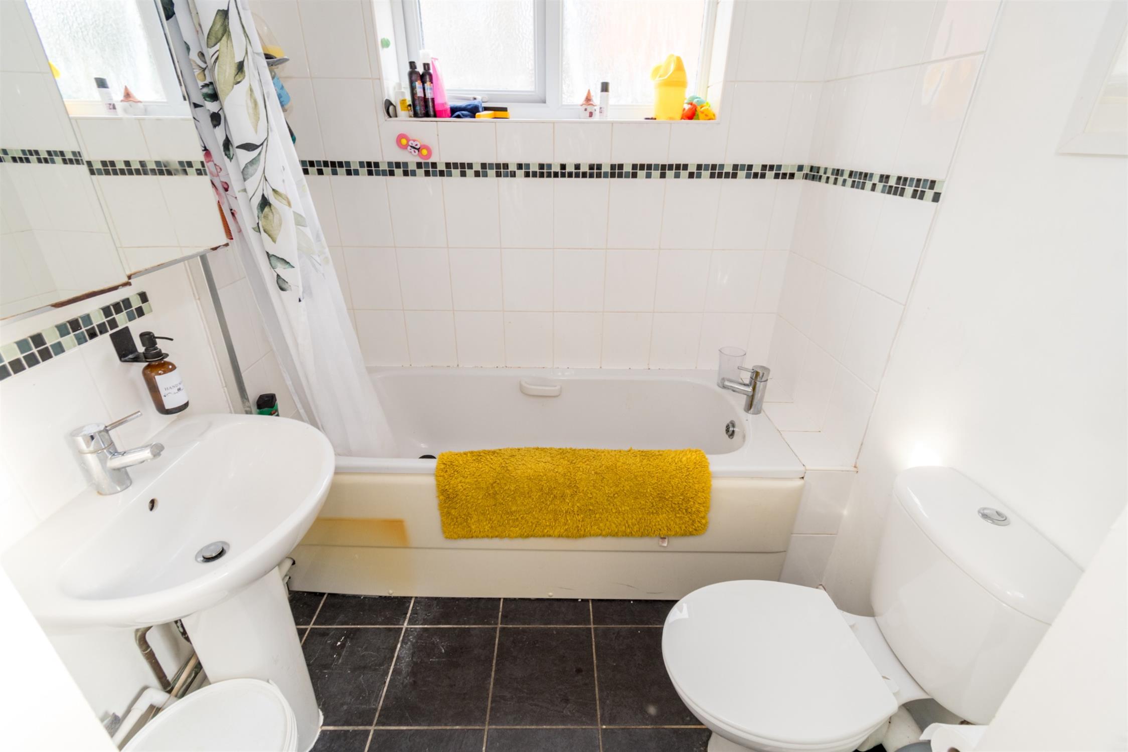 Tiled flooring. Partially tiled walls. Panel enclosed bath with shower over. Low level W.C and wash basin. Extractor fan. Obscure double-glazed window to rear aspect. Radiator.
