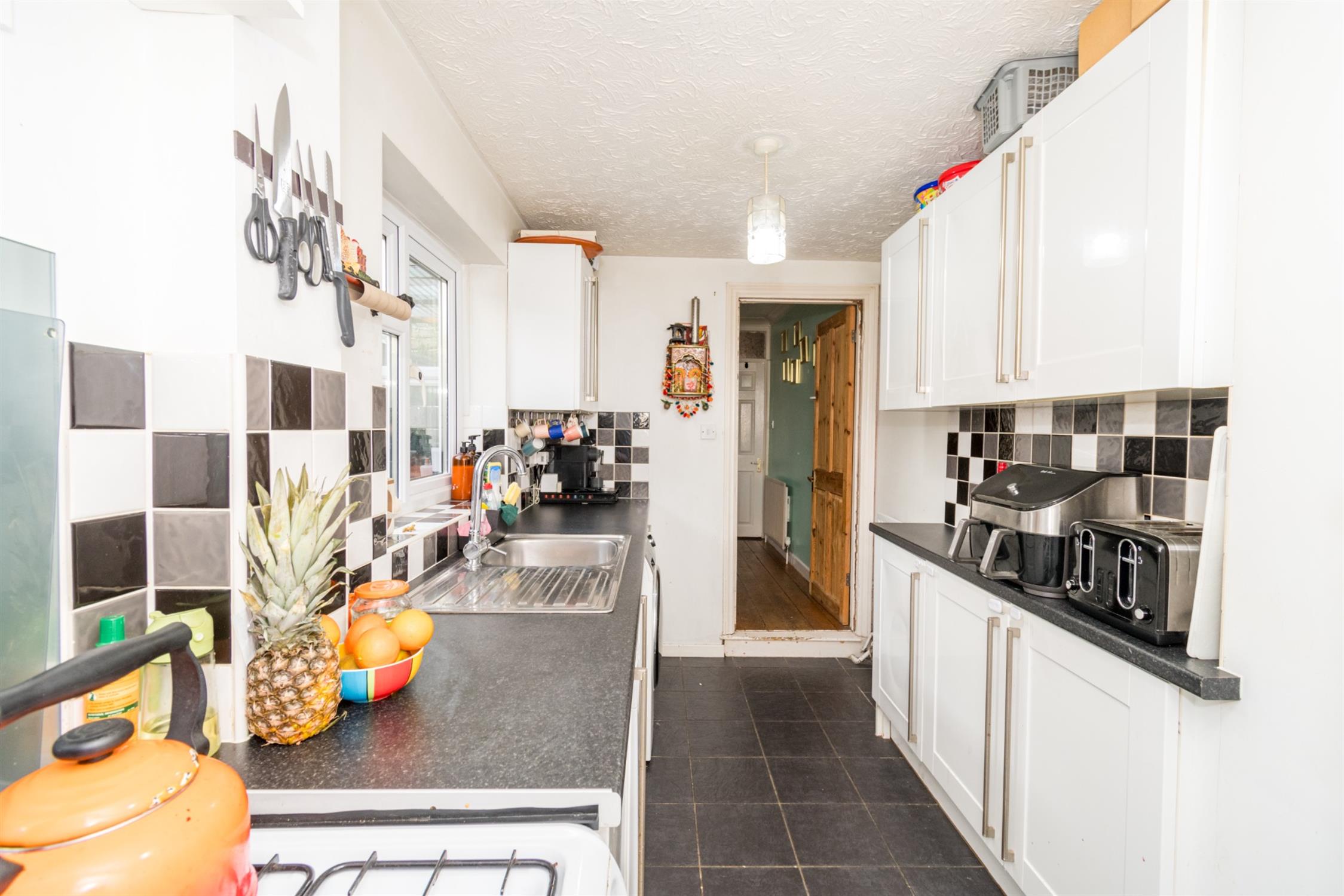 Tiled flooring. Matching wall and base units with tiled splashback. Space for washing machine and fridge-freezer and dishwasher. Inset stainless steel sink with drainer. Freestanding gas oven and hob with. Storage cupboard. Double-glazed window to side aspect. Door to-