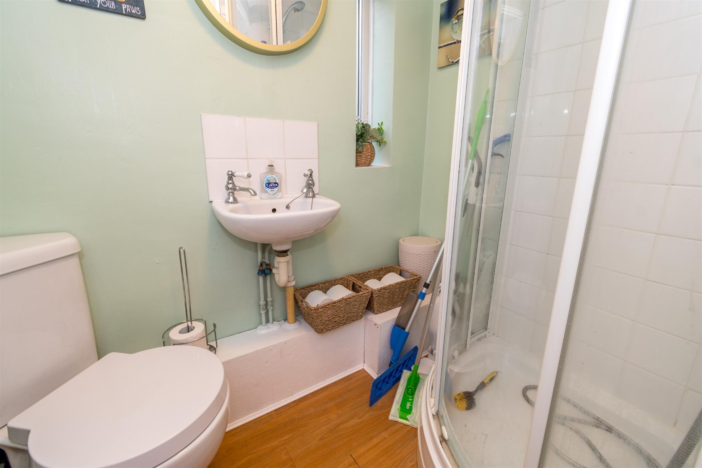 Wooden effect vinyl flooring, raised corner shower cubicle with bar valve shower unit within, corner w/c, wall mounted ceramic sink, double glazed windows to side and rear aspect, tiling to principal areas, smooth walls and textured ceiling, heated towel rail.