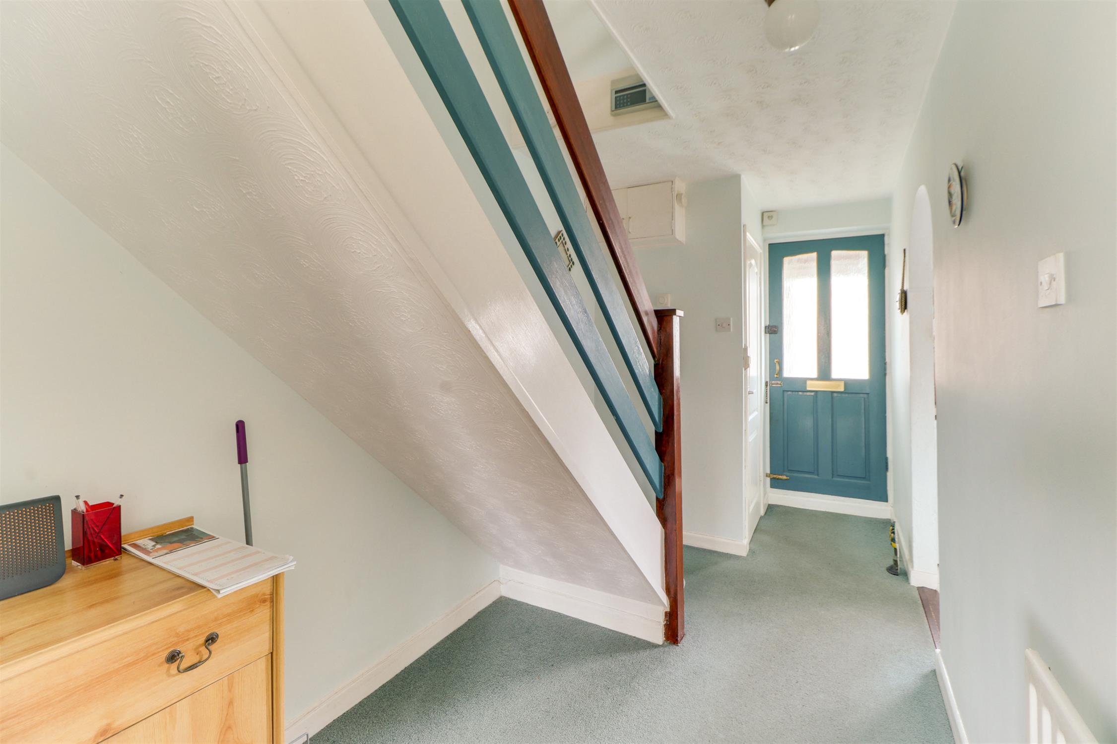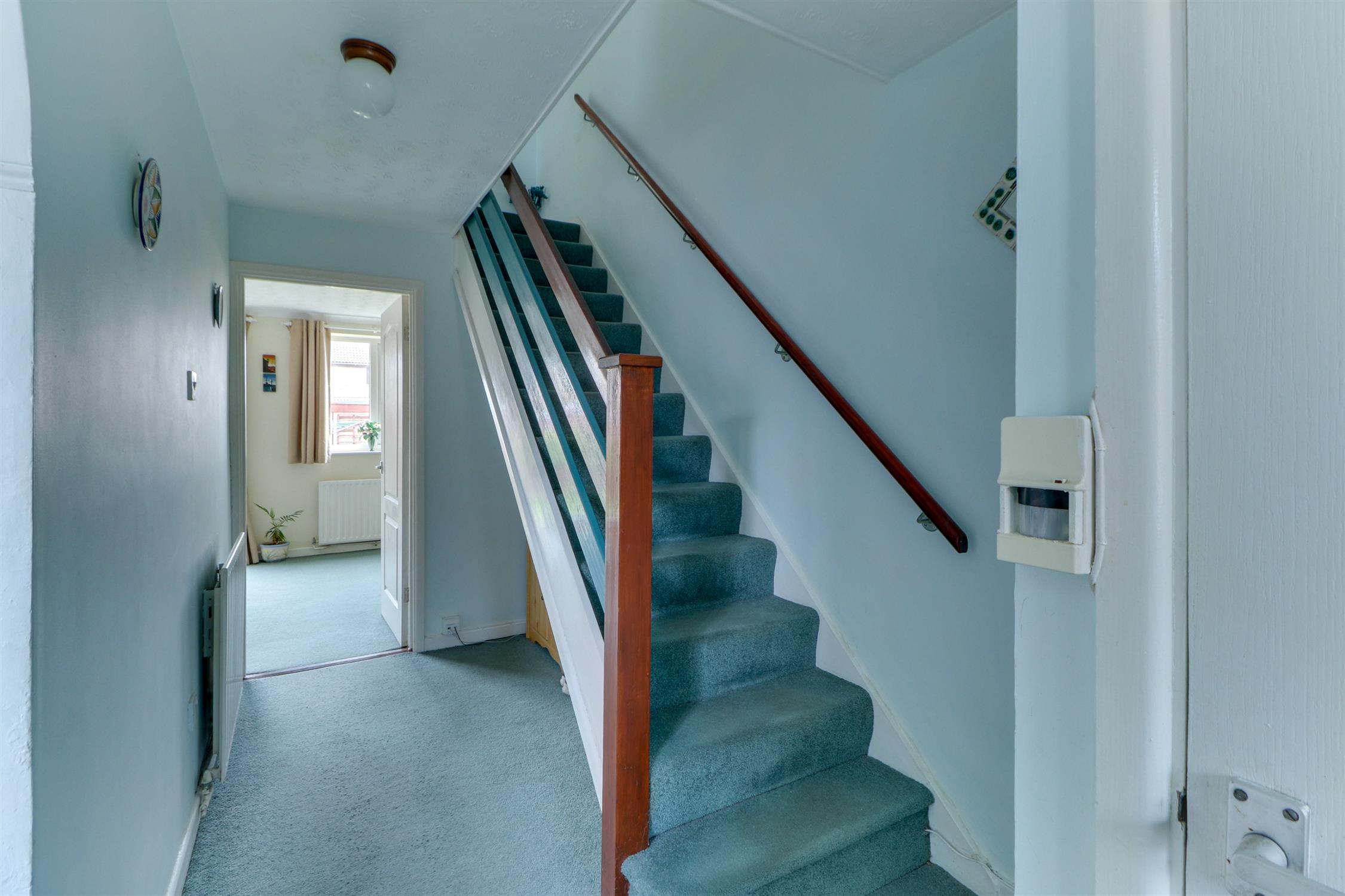 Textured ceiling, stairs rising to landing, fitted carpet and opening into;