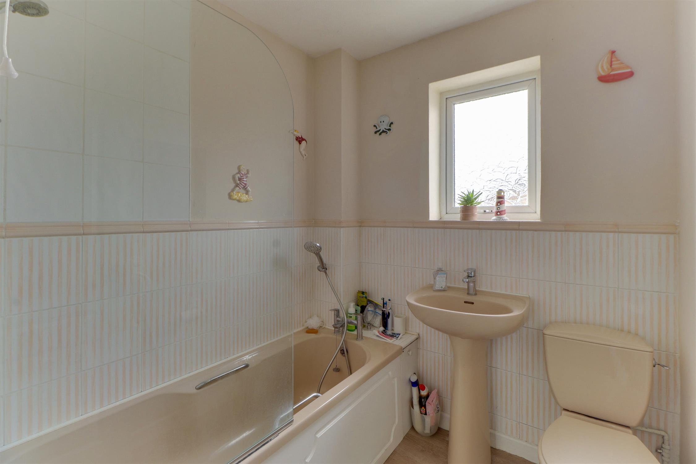 Textured ceiling, obscured UPVC double-glazed window, bath with shower over, tiled splash back, low level W.C, wash hand basin and vinyl flooring.