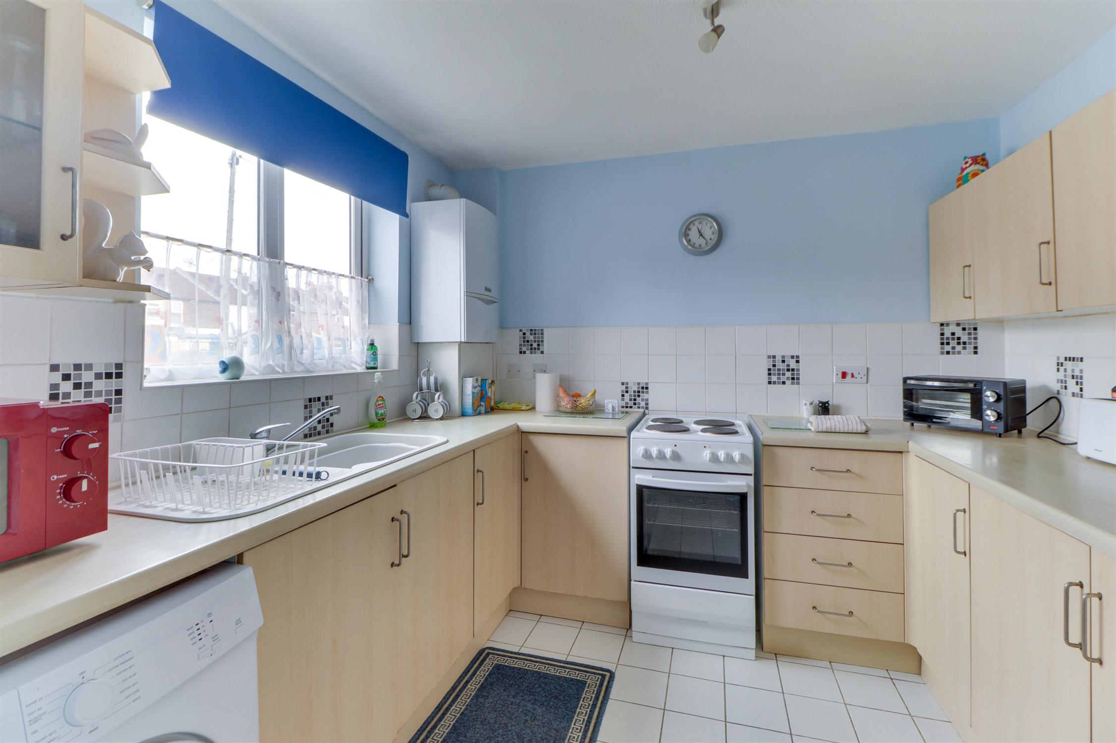 Textured ceiling, UPVC double-glazed window, wall-mounted boiler, a range of wall and base-mounted units with roll-top work surfaces over, inset sink and drainer, cooker, fridge freezer and tiled flooring.