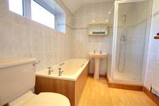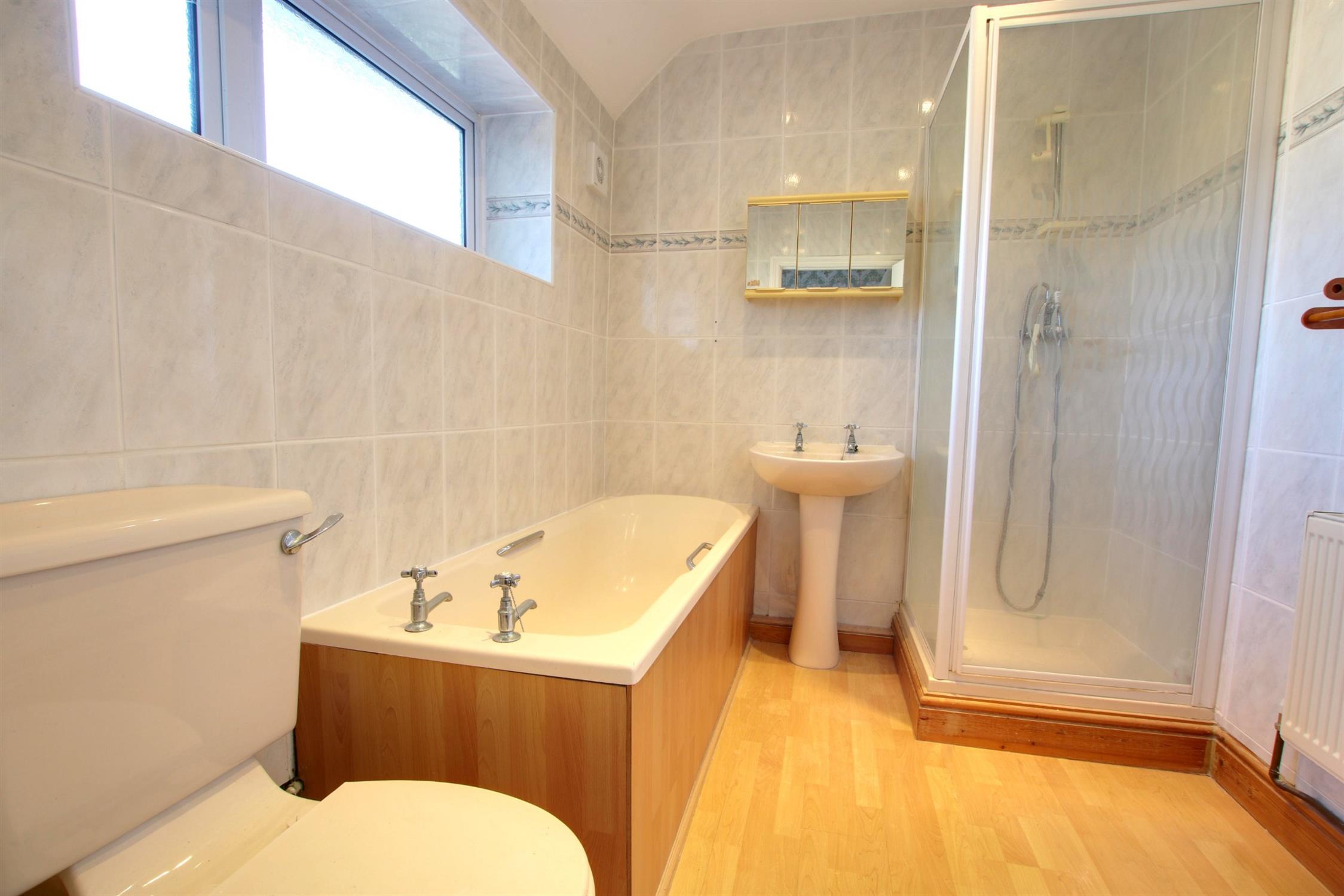 Tiled walls and laminate flooring. Shower cubicle. Low level W.C and wash basin. Panelled bath. Extractor fan. Obscure double-glazed window to front aspect.
