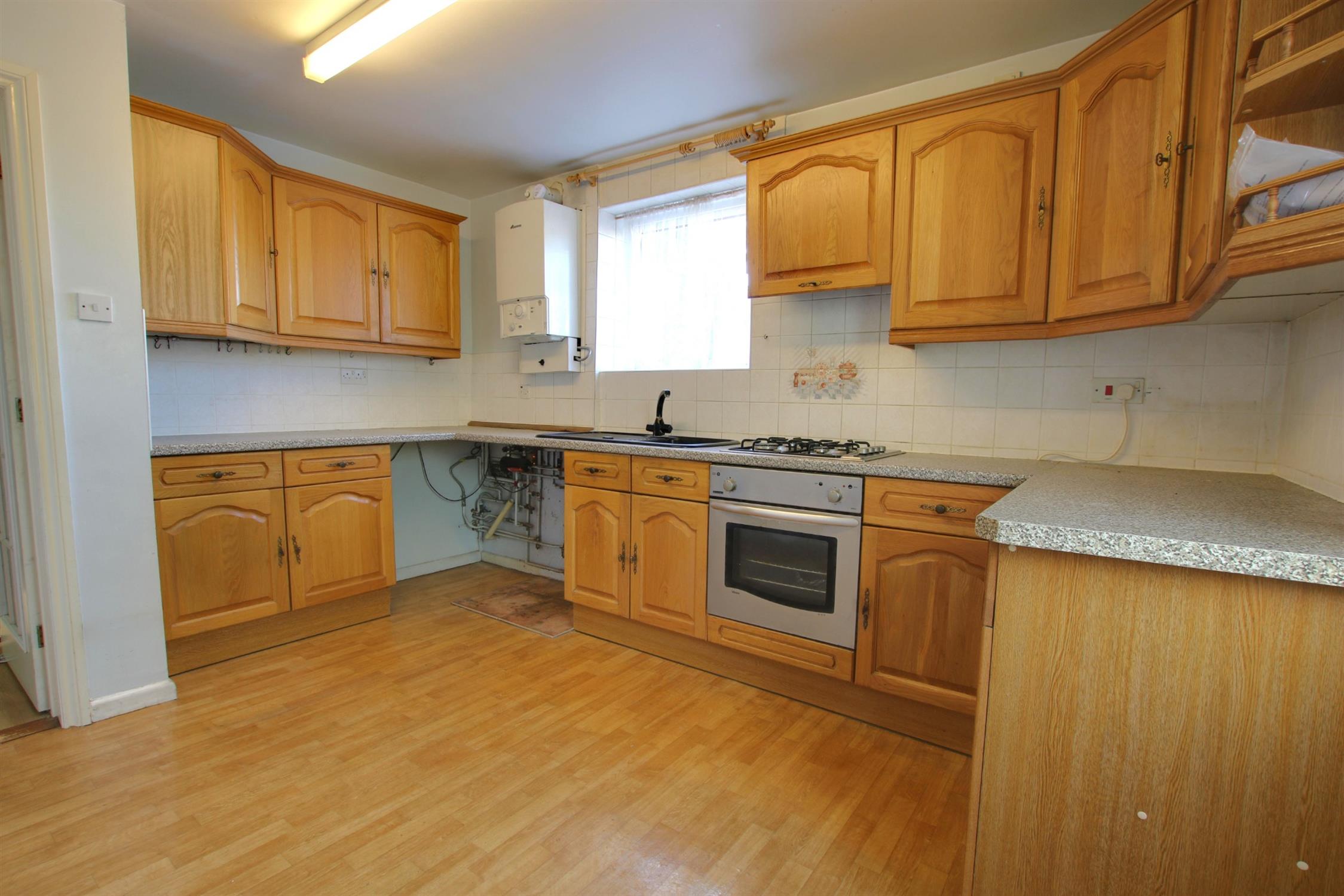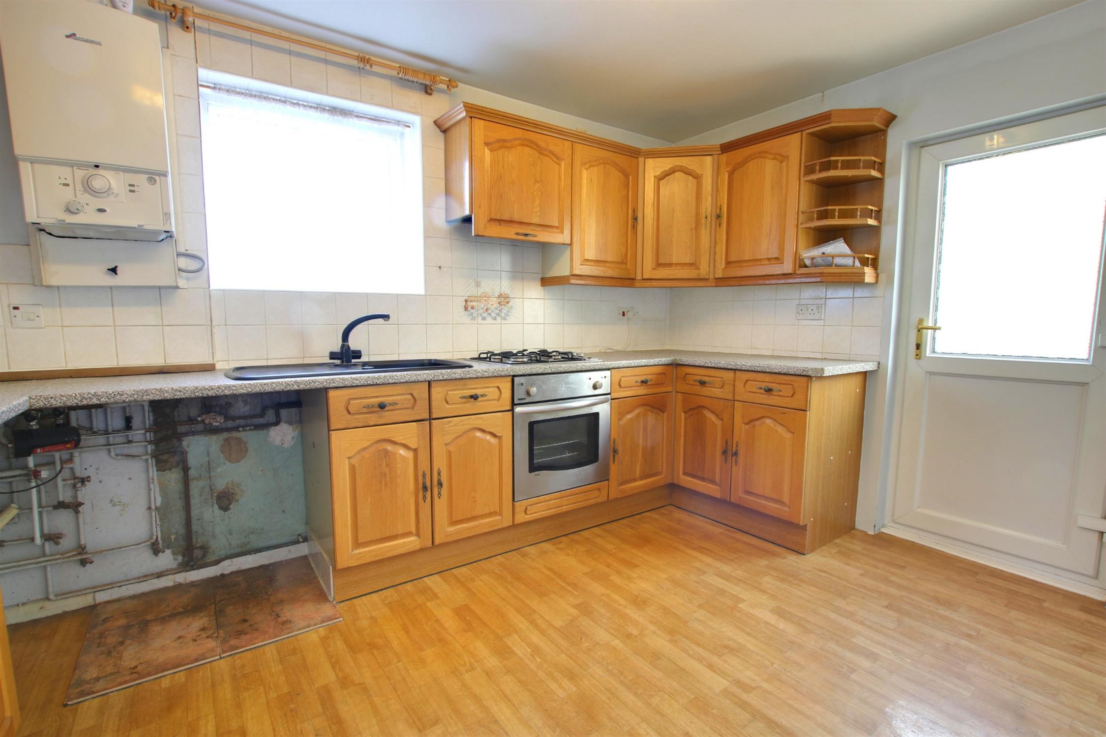 Kitchen comprises matching wall and base units. Wall-mounted boiler. Inset stainless steel sink with drainers. Integrated electric fan oven, gas hob with extractor. Space for fridge-freezer. Space and plumbing for washing machine. Lino flooring. Double-glazed windows to front aspect. Doors leading to lean to.