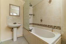 Panelled ceiling, spotlights, double glazed obscured window, radiator, WC, pedestal wash hand basin, panelled bath with shower over and screen, part tiled walls, vinyl flooring.