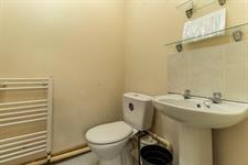 Smooth ceiling, inset spotlights, extractor fan, shower cubicle, WC, pedestal wash hand basin, ladder radiator, part tiled walls, vinyl flooring.