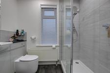 Double glazed window to the rear aspect. Smooth ceiling with inset spotlighting. Extractor fan. Modern fitted suite with large walk-in shower with glass screen. Vanity unit with wash hand basin and concealed low level WC. Part tiled walls. Radiator. Wood effect laminate flooring.