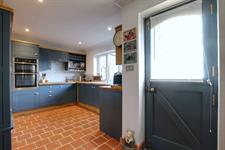 Double glazed door leading to the rear garden. Double glazed window to the rear aspect. Smooth and coved ceiling with inset spotlighting. Country style kitchen with wall and base units. Open shelving and plate display. Wooden worktops. Inset porcelain sink and half drainer. Tiled splashback. Fitted 'Neff' oven/grill. Four ring 'Neff' hob. Integrated washing machine and dishwasher. Space for fridge/freezer. Freestanding larder unit available via negotiations. Terracotta tiled flooring.