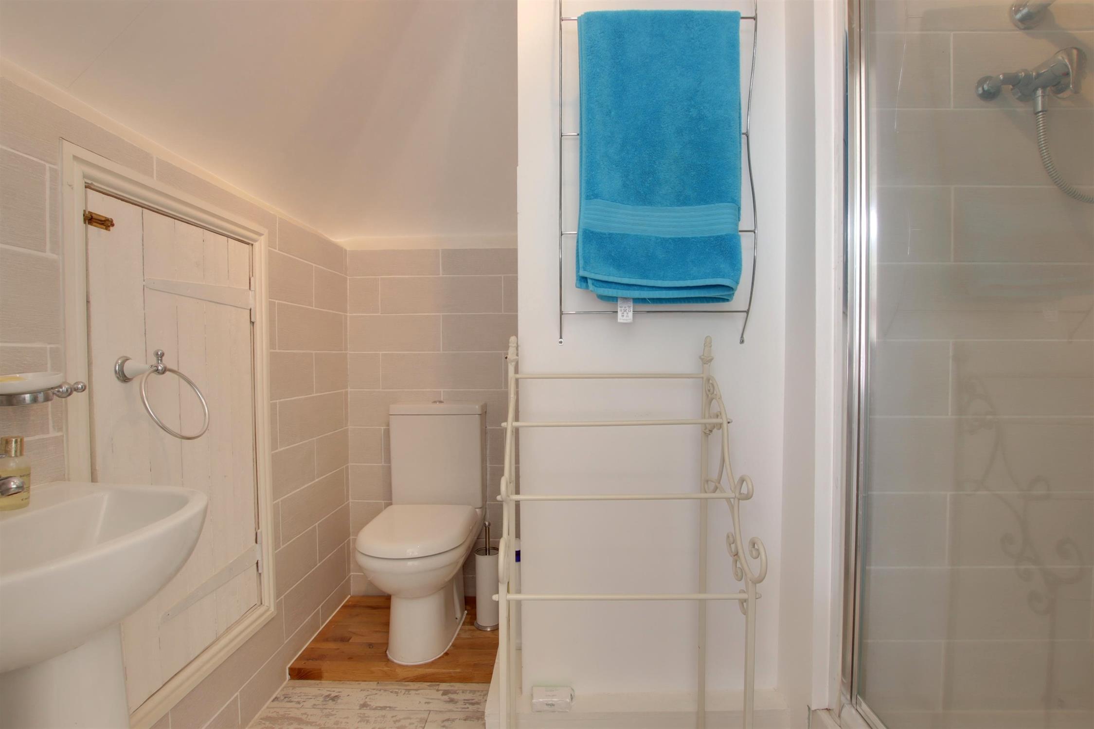Smooth ceiling. Modern suite comprising; shower cubicle. Low level WC. Wash hand basin. Part tiled walls. Wood effect flooring. Eaves storage.