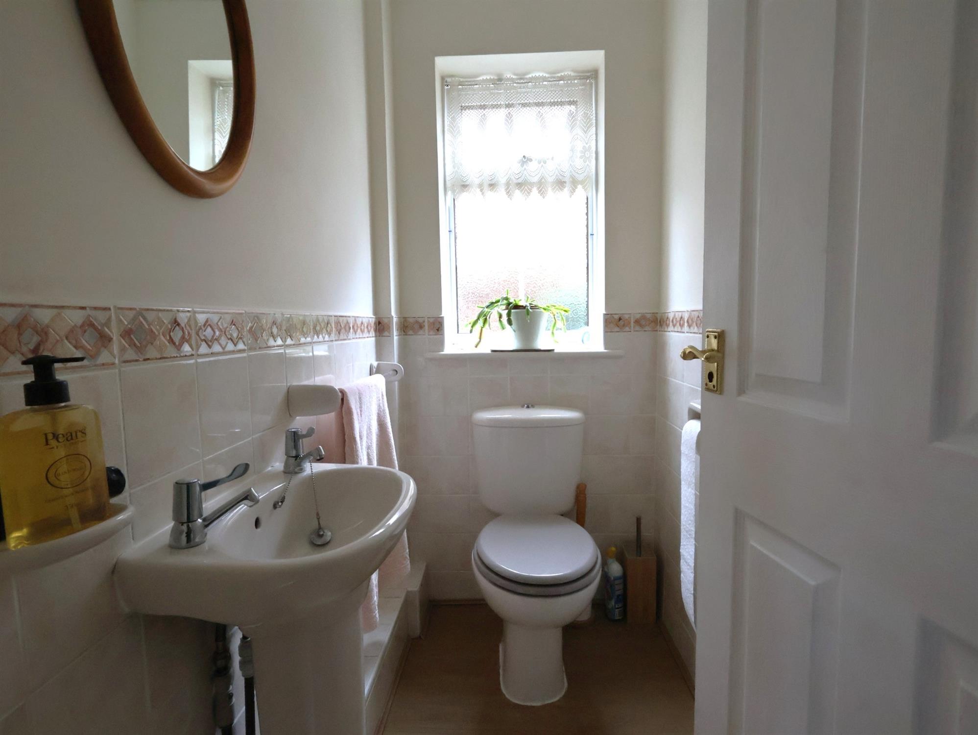 Obscure window to side. Close coupled WC. Pedestal wash hand basin. Complementary tiling. Wood effect laminate flooring. Radiator.