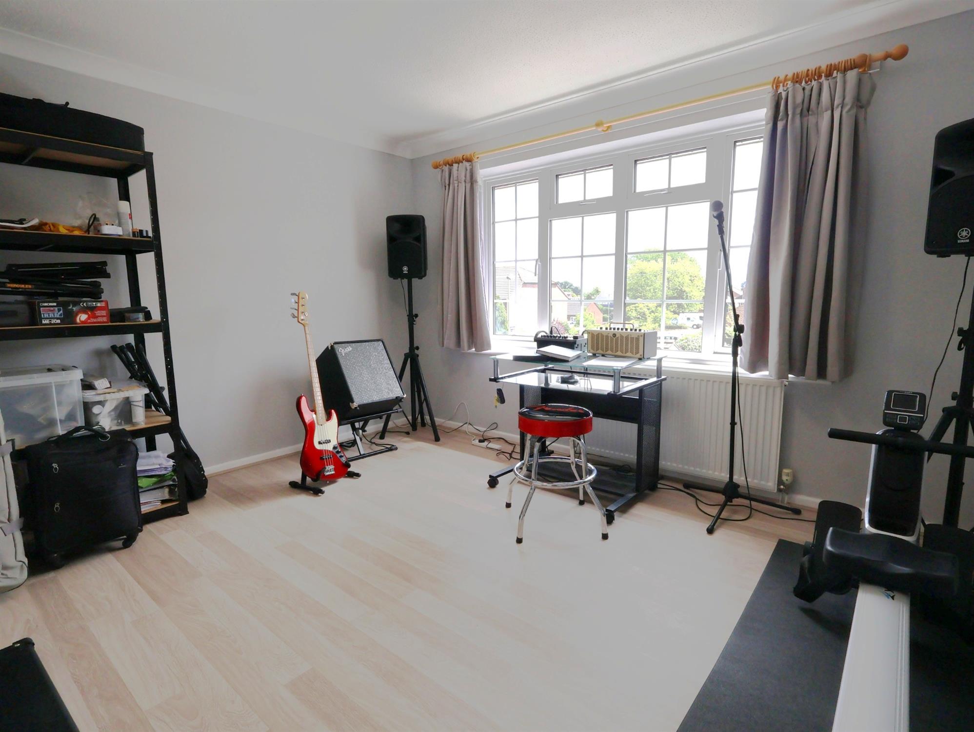Two windows to front. Wood laminate flooring. Radiator. Door to: