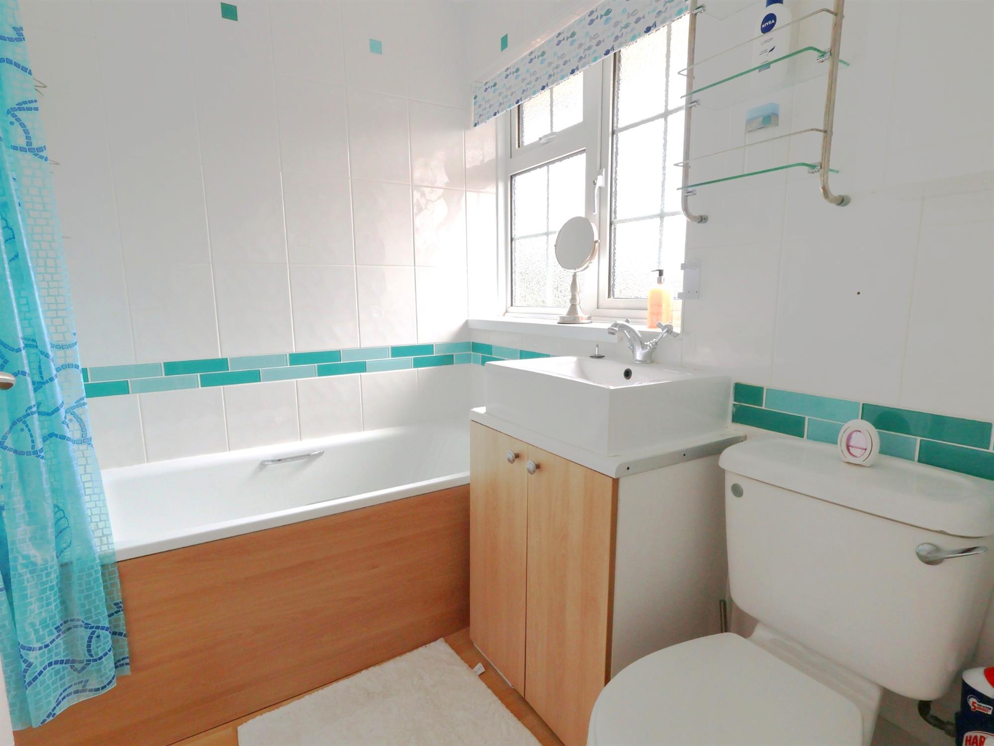 Obscure window to front. Comprising white suite of panelled bath with mixer taps and shower attachment. Wash hand basin with built in storage cupboard below. Close coupled WC. Wood effect laminate flooring. Fully tiled. Radiator.