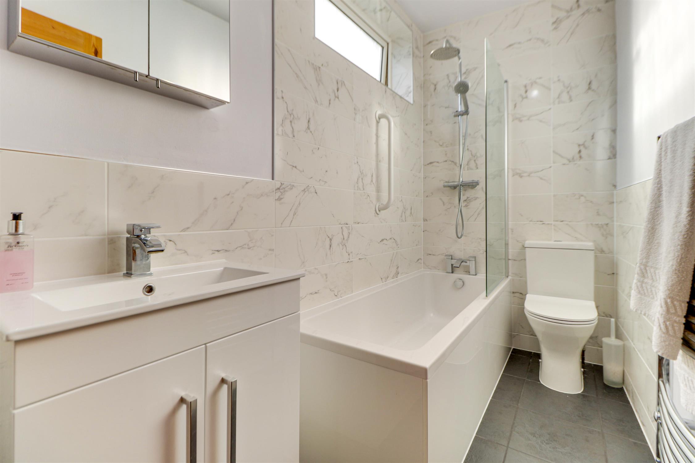 Smooth ceiling, double glazed obscured window, panelled bath with shower and screen, WC, wash hand basin with cupboards beneath, ladder radiator, part tiled walls, tiled floor.