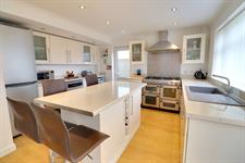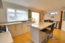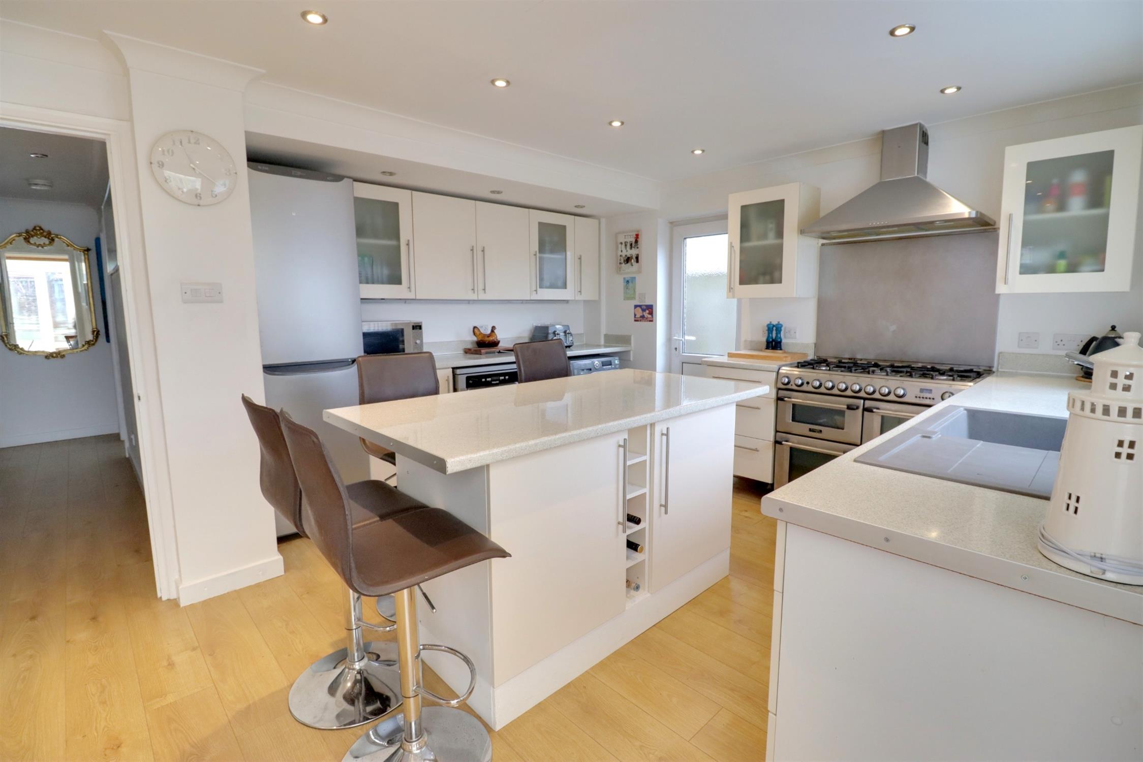 Fitted with a comprehensive range of modern wall and base units with worksurfaces over, range cooker with extractor hood over, spaces for washing machine, dishwasher and fridge/freezer, inset sink and drainer, large island with breakfast bar, tall radiator, side and rear aspect double glazed windows, side aspect double glazed door, laminate flooring, open aspect leading to the conservatory.