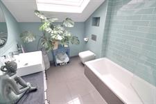 'Velux' style roof window, panel enclosed bath with rainfall shower head and hand-held shower attachment, shower screen, dual flush WC, hand basin with mixer tap, vanity storage, tiled splashbacks, tiled flooring, ladder-style towel radiator. Ceiling extractor.
