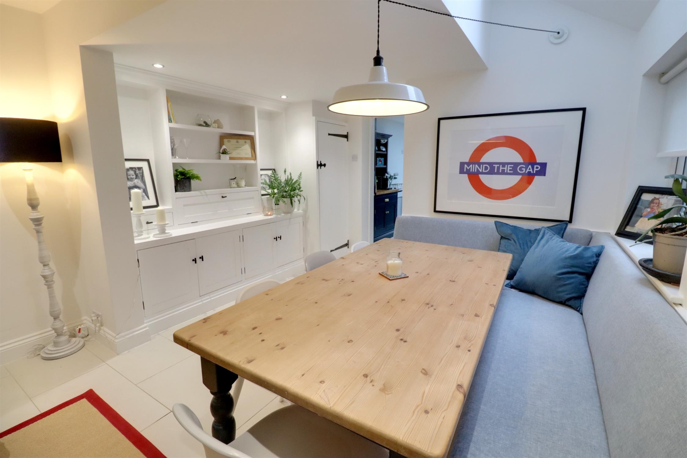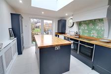 Double glazed French doors to rear garden, double glazed roof lantern, modern shaker-style wall and base units, pan drawers, solid oak worktops, enamel butler sink, NEFF double electric oven, NEFF induction hob, concealed overhead extractor, integral dishwasher, plumbing and space for washing machine, space for American style fridge freezer, breakfast island with solid oak worktop and base storage cupboards, additional built-in storage cupboards and shelving, wine cooler, concealed wall mounted Worcester combination boiler (fitted approx five years ago), tiled flooring.