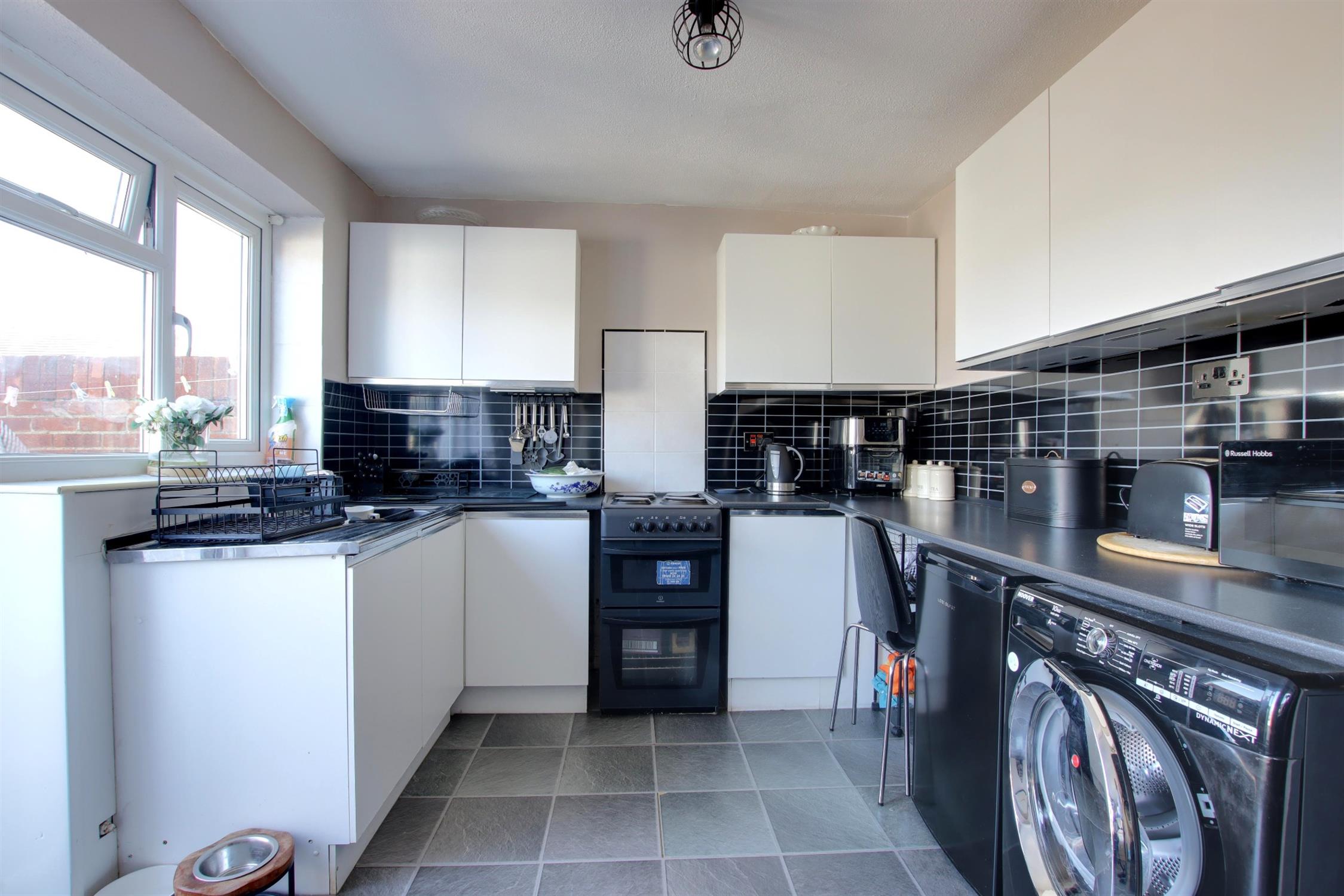 Double glazed door leading to the rear garden. Two double glazed windows to the rear aspect. Wall mounted 'Vaillant' boiler. Matching wall and base units with contrasting worktops. Inset stainless steel sink and drainer. Space for cooker, washing machine, fridge/freezer and an additional low level fridge or freezer. Understairs storage cupboard. Radiator. Tile effect flooring.